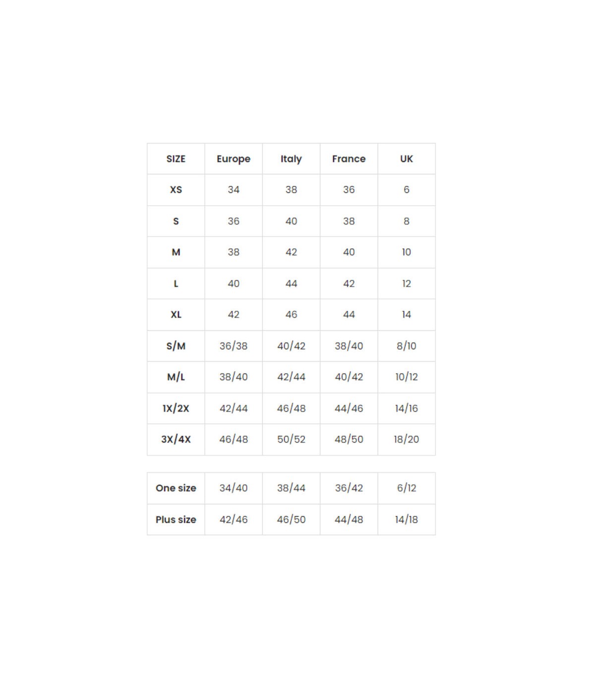 | Euro | 32/34 | 36 | 38 | 40 |