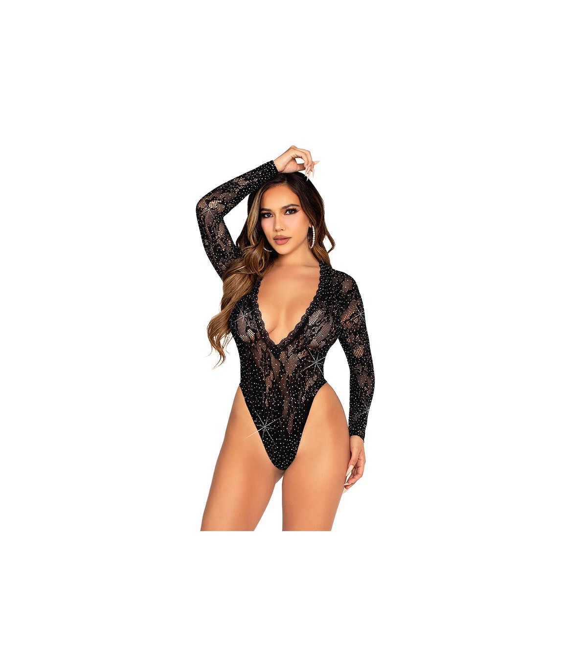 Este Body de Encaje con Manga Larga y Detalles de Diamantes en Negro es la combinación perfecta de elegancia y sensualidad.
