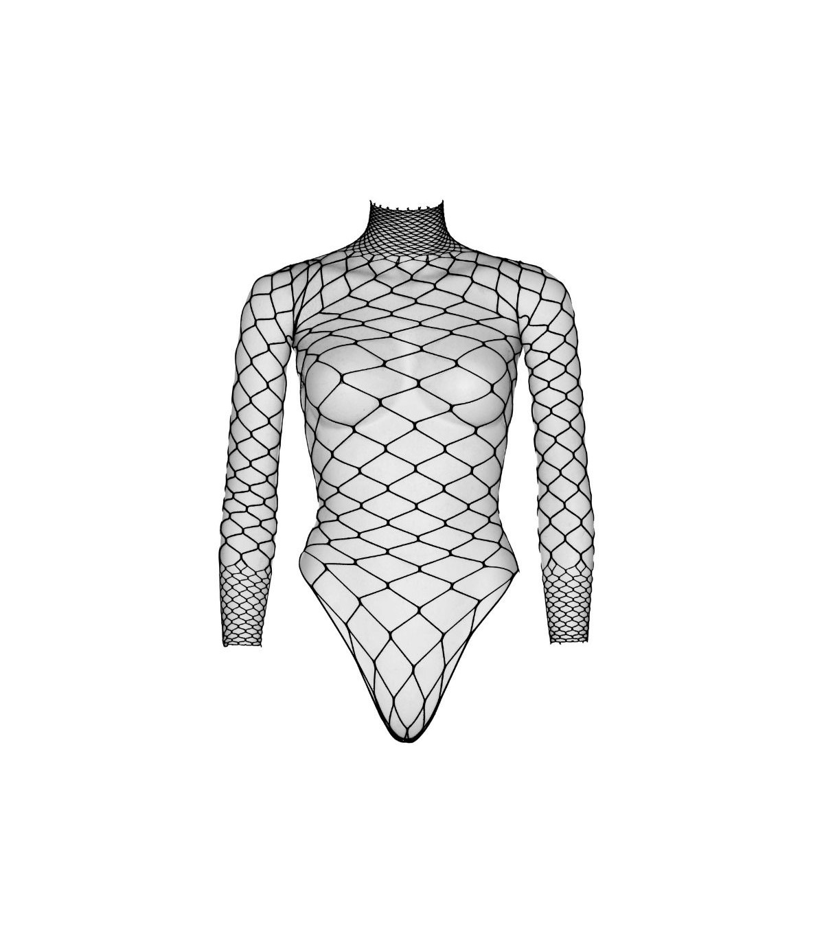 Teddy de manga larga y cuello alto en cuerpo de red con pezoneras fabricado por la prestigiosa marca de lencería Leg Avenue.