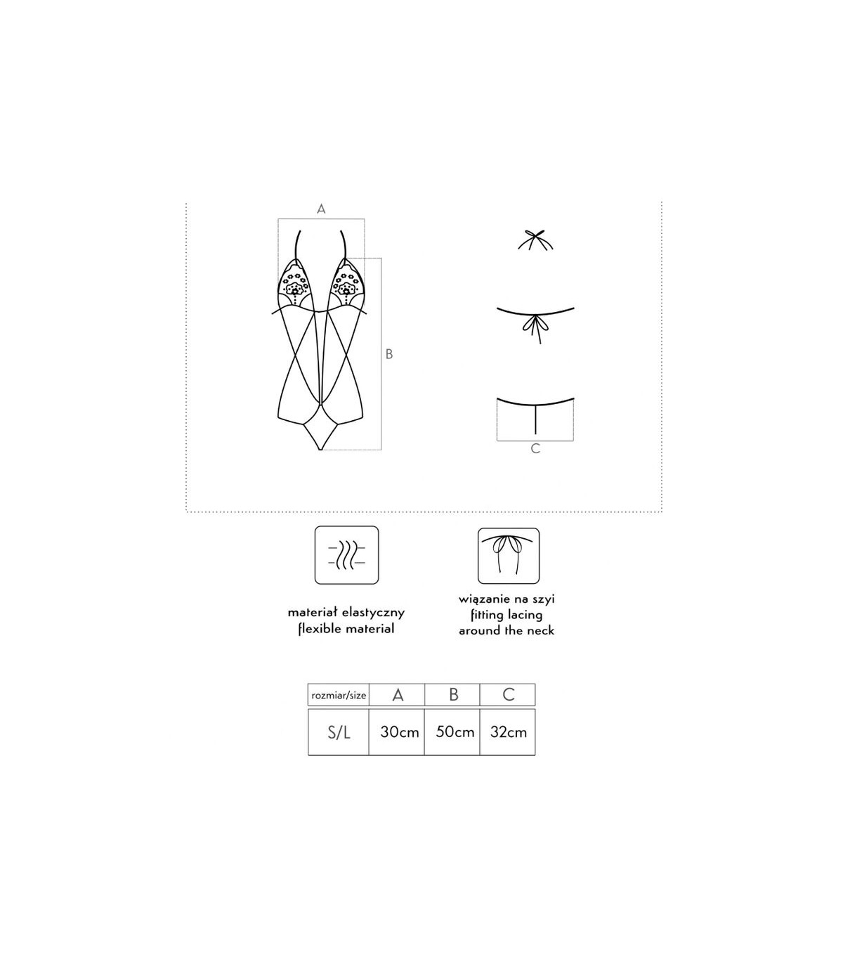 El material elástico 90 % poliamida y 10 % elastano hace que el body sea agradable al tacto y cómodo de llevar. El cordón ajustable en el cuello y la espalda facilita el ajuste del body, por lo que está disponible en talla universal S/L.