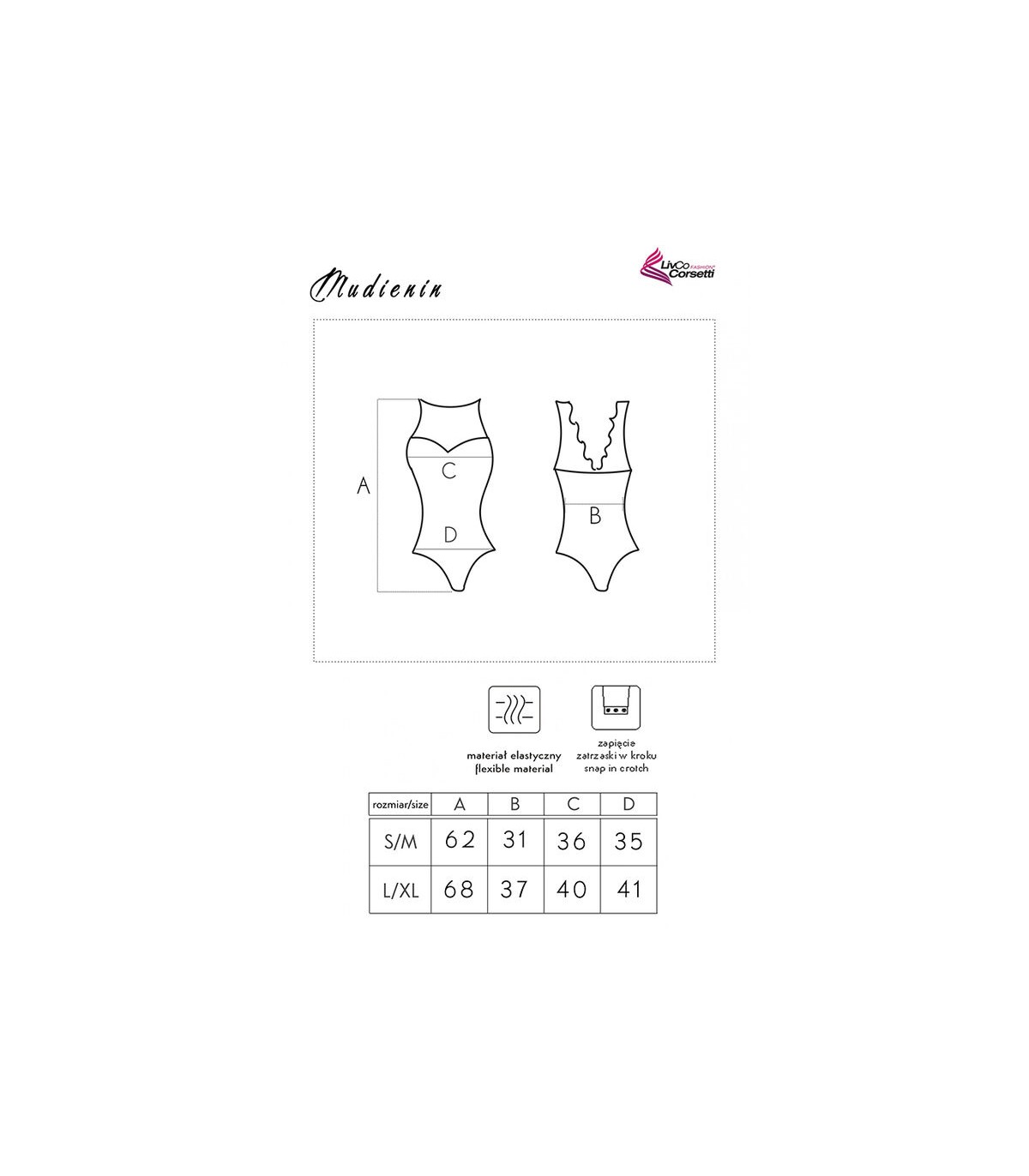 El body Mudienin está hecho de un material que contiene fibras de elastano. Gracias a ellos, el conjunto se adapta bien a la forma del cuerpo y es muy cómodo de llevar, al mismo tiempo que no queda ajustado y no restringe el movimiento. Su ventaja es una textura satinada, extremadamente agradable para la piel, y un encaje de alta calidad, que aporta elegancia al conjunto. El body se puede llevar solo como conjunto de noche, pero también como elemento de estilismo. La modelo se verá hermosa en combinación con unos pantalones elegantes y una chaqueta.