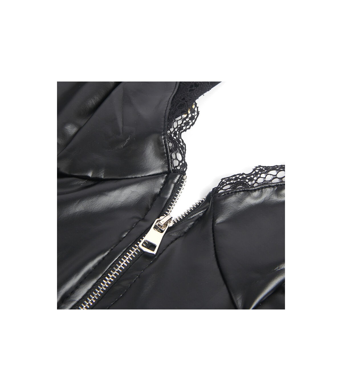 El color negro, elegante y versátil, junto con el contraste del encaje y el acabado en cuero PU, hace que este conjunto sea perfecto para resaltar tu lado más audaz y sofisticado.