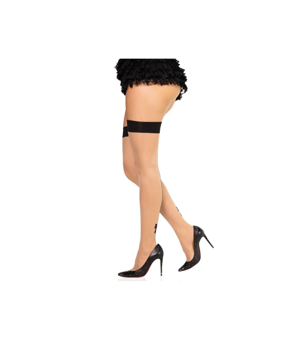 Estas atrevidas medias de estilo liguero presentan un acabado negro translúcido con llamativos detalles de cordones entrelazados a lo largo de las piernas y la cintura. El diseño de talle alto realza la silueta, mientras que la parte trasera abierta y el look de liguero integrado añaden un toque atrevido y provocativo. El tejido suave y elástico garantiza un ajuste cómodo, siendo la elección ideal para combinar con lencería, ropa de club o looks sensuales que exigen atención.