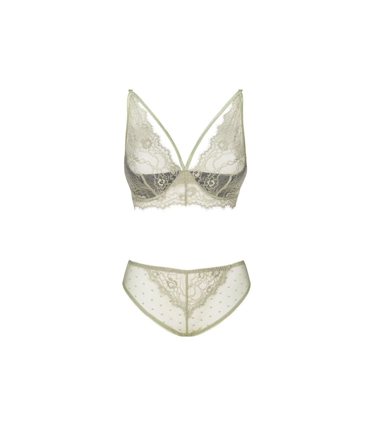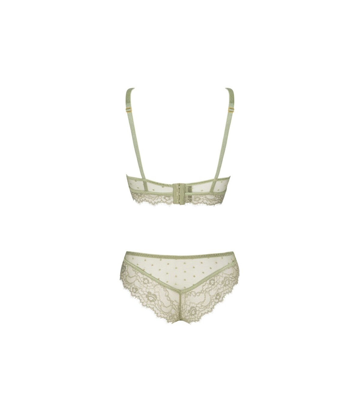 El conjunto de lencería es una obra de arte del encaje. El sujetador no está rígido y además está equipado con dos tirantes en el escote, por lo que seguramente llamará mucho la atención cuando se mire por debajo de una camisa o blusa. El sujetador sujeta bien el busto, lo que significa que las mujeres con senos más grandes también podrán usarlo. La ropa interior tentadora en color verde crudo también incluye braguitas de encaje cómodas y al mismo tiempo sensuales que, aunque son un poco más corpulentas, crean una atmósfera sexy. El diseño de las bragas resalta perfectamente los glúteos de las mujeres, haciendo que cada mujer se sienta especial. El conjunto es perfecto tanto para el día a día como para momentos un poco más especiales.