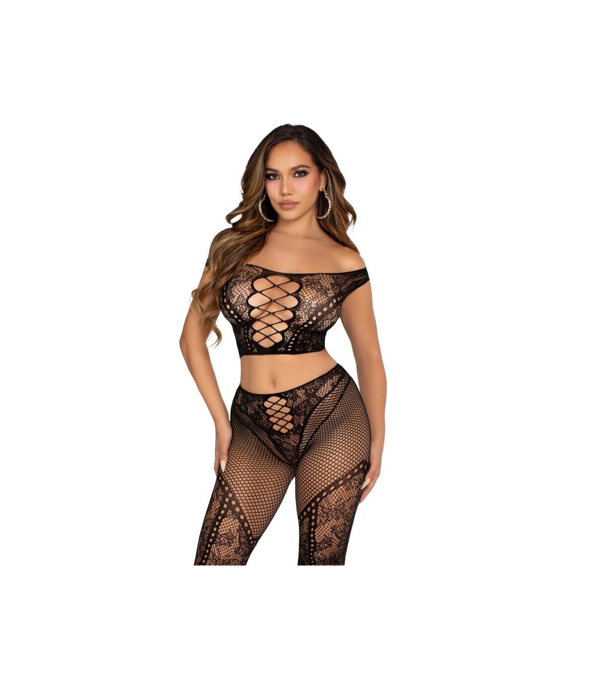 Da rienda suelta a la seductora que llevas dentro con el conjunto de top con hombros descubiertos y legging, un conjunto de ensueño diseñado para abrazar todas las curvas. Este conjunto de dos piezas incluye un crop top sin hombros con una atrevida lazada frontal que destila elegancia y sensualidad. Los leggings de cintura alta complementan el look con su intrincado diseño de encaje y rejilla, añadiendo el equilibrio perfecto entre romanticismo y vanguardia.
