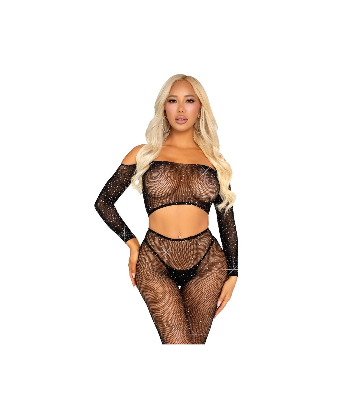 Brilla con el top corto y leggings de rejilla con pedrería, diseñados para quienes aman destacar. Este conjunto atrevido y glamuroso presenta un delicado diseño de rejilla adornado con brillantes pedrería, combinando un encanto vanguardista con un estilo deslumbrante.