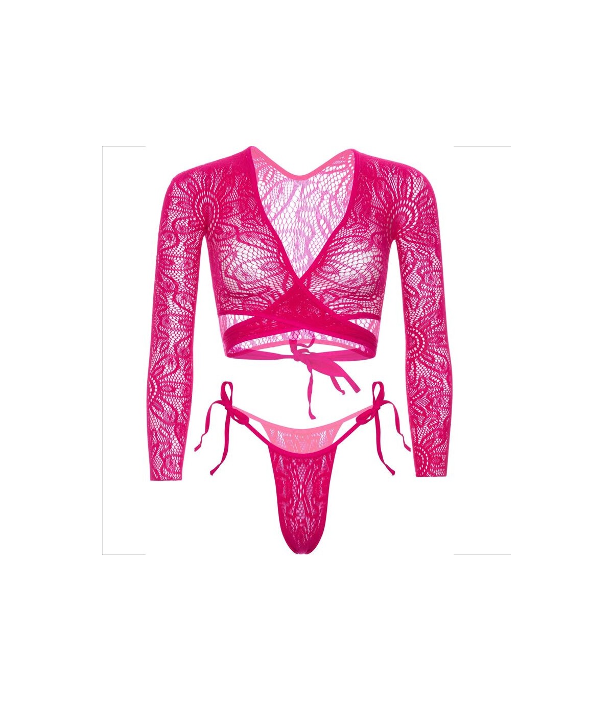 Embárcate en un viaje de elegancia y encanto con nuestro cautivador conjunto de lencería, que presenta un top corto envolvente de encaje y una provocadora braguita con lazo lateral. Este exquisito conjunto fusiona la delicadeza del encaje con detalles cautivadores, creando una experiencia única que resalta tu feminidad con un toque de estilo juguetón.