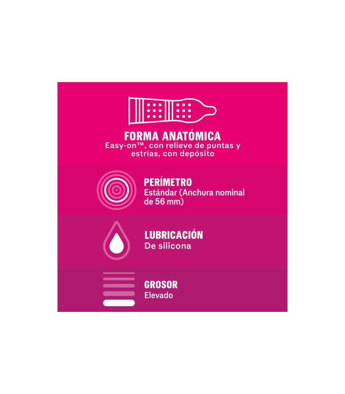Durex Dame Placer son preservativos que suben la temperatura entre las sábanas. Sus puntos y estrías crean una experiencia sexual más intensa para ti y tu pareja.