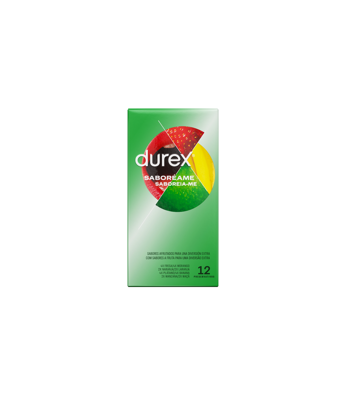 Durex Saboréame son preservativos con sabores afrutados para una diversión extra. Preservativos con aromas y sabores a: fresa, plátano, naranja y manzana. Los preservativos Durex Saboréame, con sus colores y sabores, añaden un toque de diversión a tus relaciones.