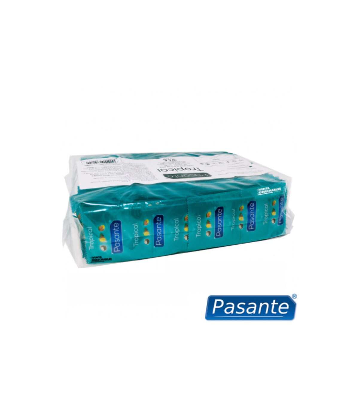 Los preservativos Pasante Tropical ofrecen tres sabores exóticos; Mango (naranja - 48 unidades), Piña (amarillo - 48 unidades) y Coco (transparente - 48 unidades). Preservativos lisos, paralelos y con punta de tetina.