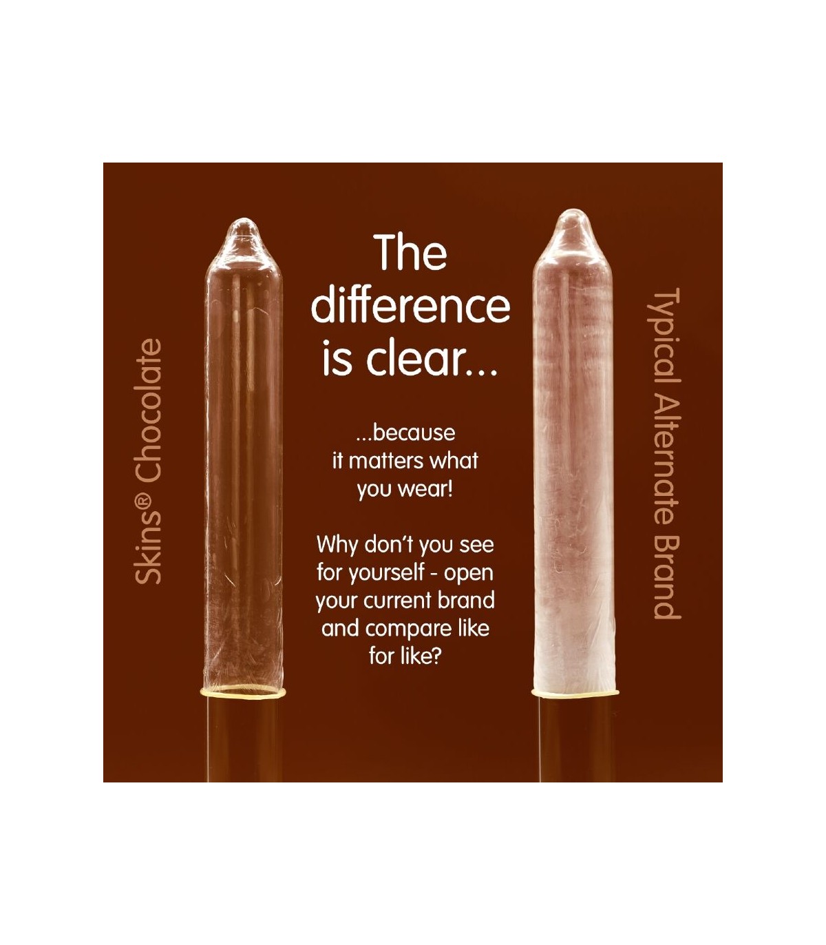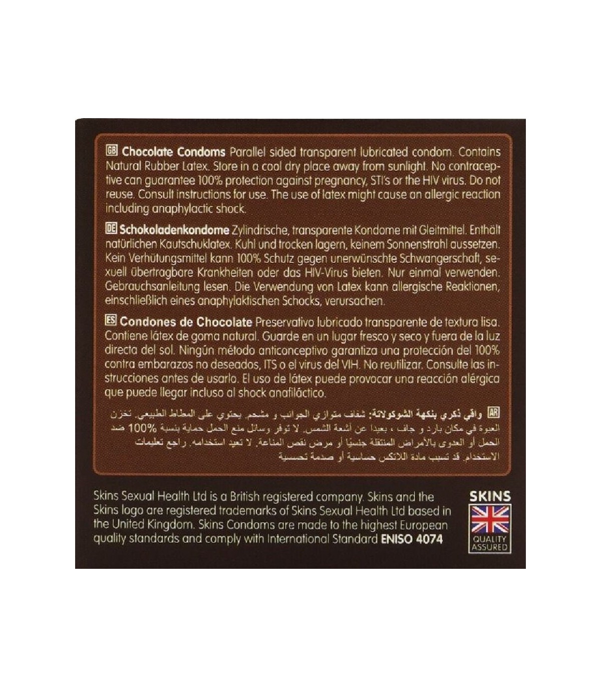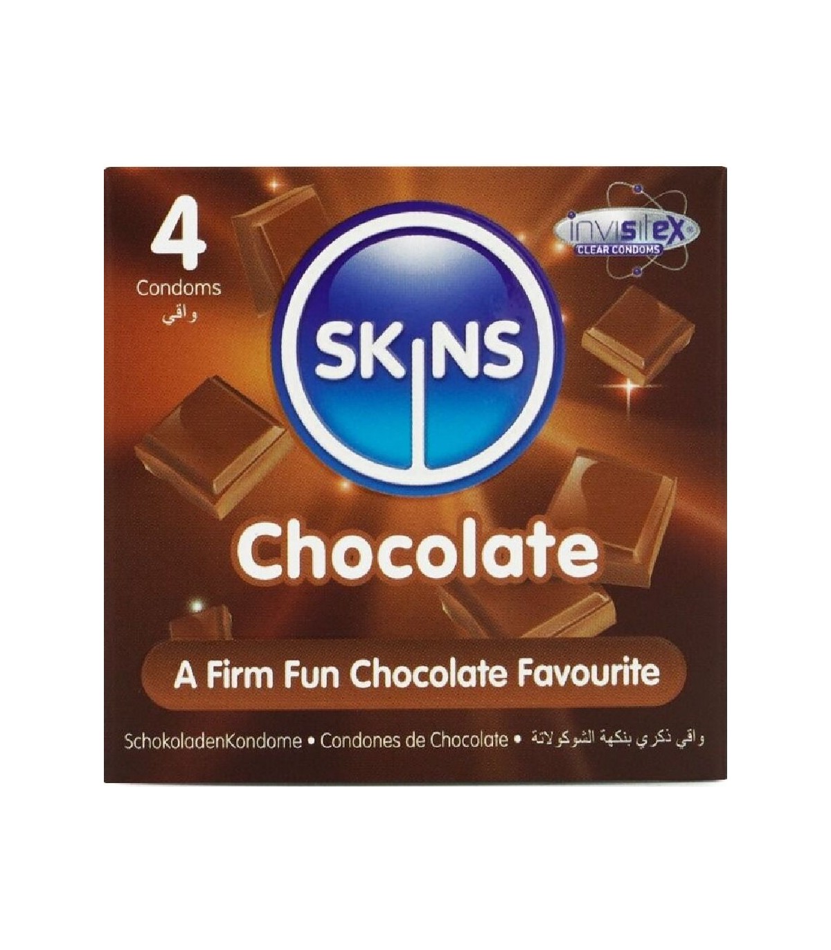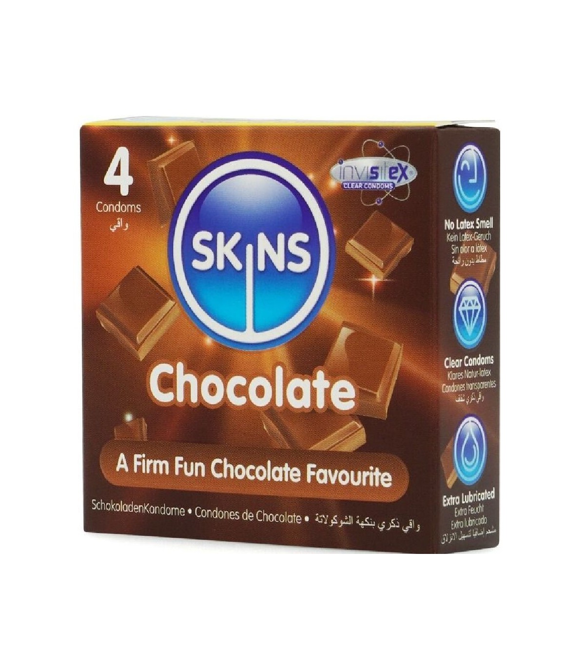 Presentamos nuestro nuevo paquete de 4 con sabor a chocolate, con un diseño elegante y listo para usar, y hasta un 33 % más de condones que el líder del mercado. Atrae a quienes buscan un producto íntimo divertido y de alta calidad con los condones Skins sabor chocolate. Estos condones envueltos individualmente combinan un sabor placentero con una protección superior, lo que los convierte en la opción ideal para tiendas de productos para adultos, farmacias y distribuidores de productos de bienestar. Estos condones Skins son una excelente manera de combinar dos amores: el sexo y el chocolate. Están lubricados y tienen un delicioso aroma a chocolate, realmente tentador, y además saben a chocolate. Como todos los condones Skins, están hechos de látex de alta calidad, dermatológicamente probado, que te brindará la protección que necesitas.