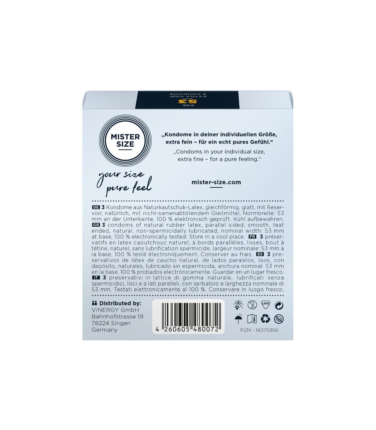 MISTER SIZE te brinda una sensación completamente nueva durante el sexo al mismo tiempo que ofrece una seguridad óptima. Todos nuestros preservativos MISTER SIZE cumplen con la norma DIN EN ISO 4074:2002 y están sujetos a pruebas minuciosas. Tener un preservativo con una seguridad óptima genera confianza y seguridad que les permite a ambos relajarse y dejarse llevar por completo durante el acto sexual.
