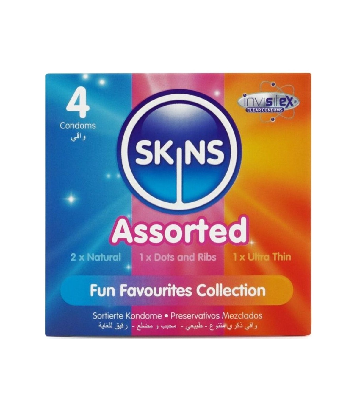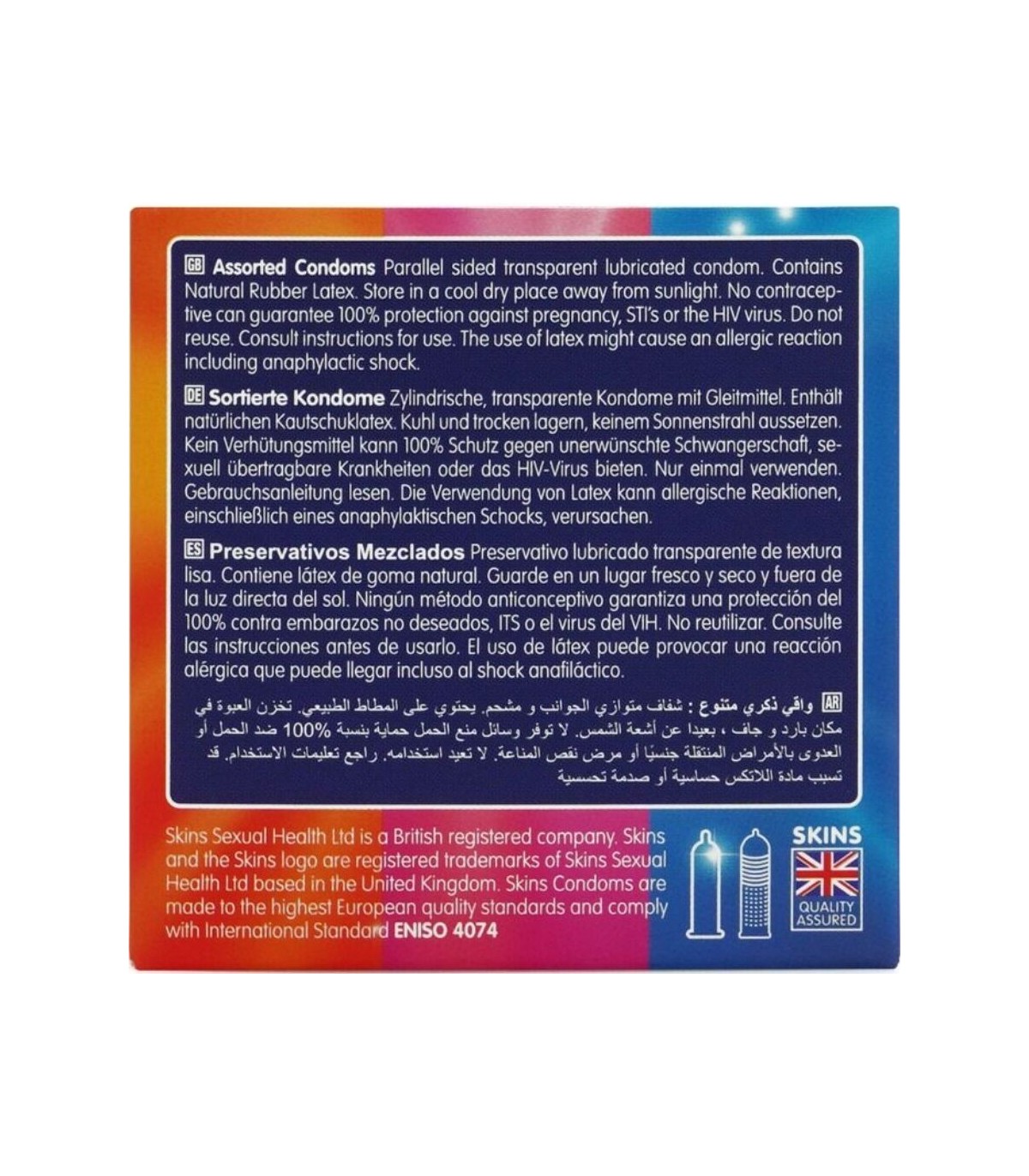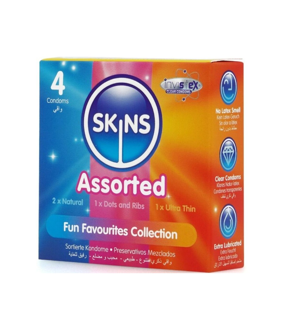 Añade variedad a tu vida sexual y mantente protegido con los condones surtidos de Skins. 4 condones individuales en 3 emocionantes variedades, cada paquete contiene una mezcla de condones naturales, con puntos y estrías y ultrafinos, lo que le permite disfrutar de diferentes aventuras de placer con este paquete surtido de los favoritos de Skins.