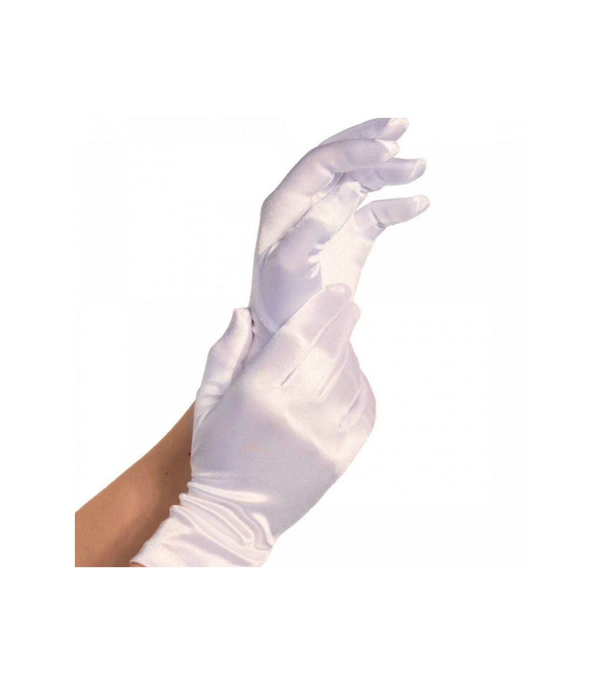 Guantes cortos, elásticos y adaptables. Color blanco. Efecto raso brillante, muy elegantes para fiesta, ceremonia, evento o boda..