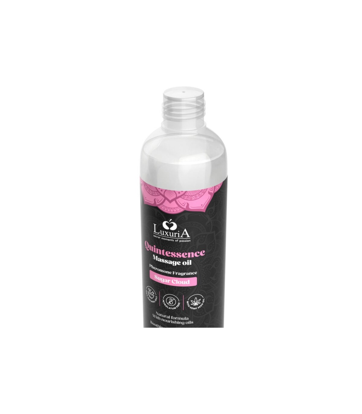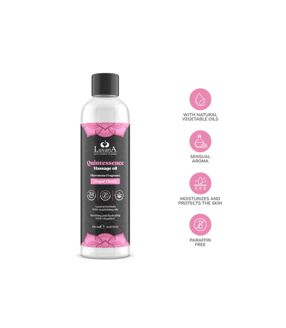 Quintessence Massage Oil, Nube de azúcar. Es un aceite natural y refinado para masajes, enriquecido con formulaciones exclusivas a base de aceites de alta calidad y esencias estimulantes cuidadosamente seleccionadas. Su fórmula nutritiva, elaborada con aceites vegetales completamente naturales, combinada con aromas sensuales, proporciona una hidratación intensa, dejando la piel suave y perfumada. Libre de parafina, el aceite Quintessence Massage Oil respetará y protegerá tu piel gracias a la presencia de aceite de semillas de cáñamo, estimulando tus sentidos con suaves notas de azúcar glas que te acompañarán durante todo el masaje, guiándote hacia la Quintessencia del placer.