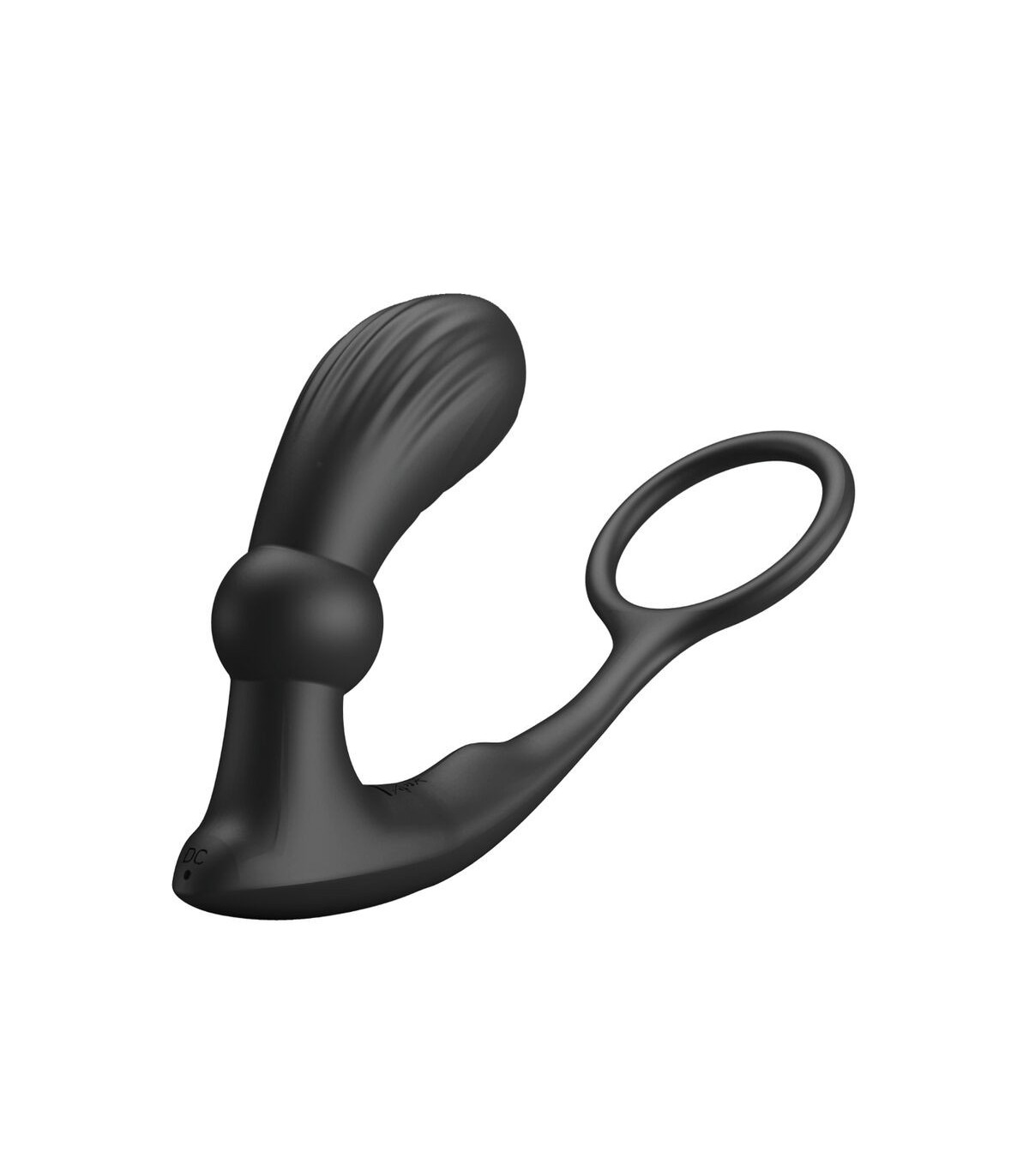 Este anillo para el pene con plug anal con control remoto es un anillo combinado para el pene y la bola con un tapón anal vibratorio sujeto de forma segura.