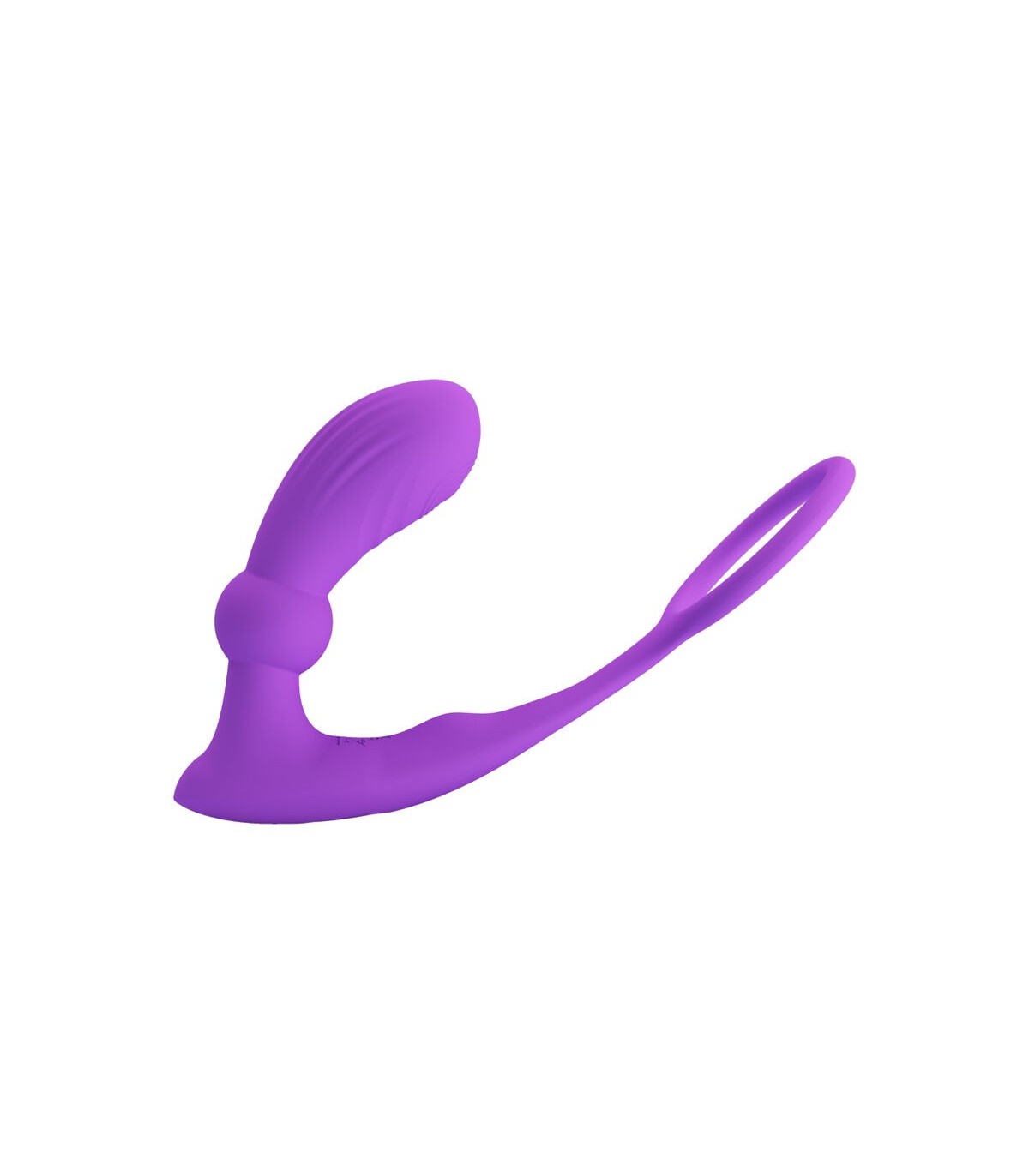 Este anillo para el pene con plug anal con control remoto es un anillo combinado para el pene y la bola con un tapón anal vibratorio sujeto de forma segura.