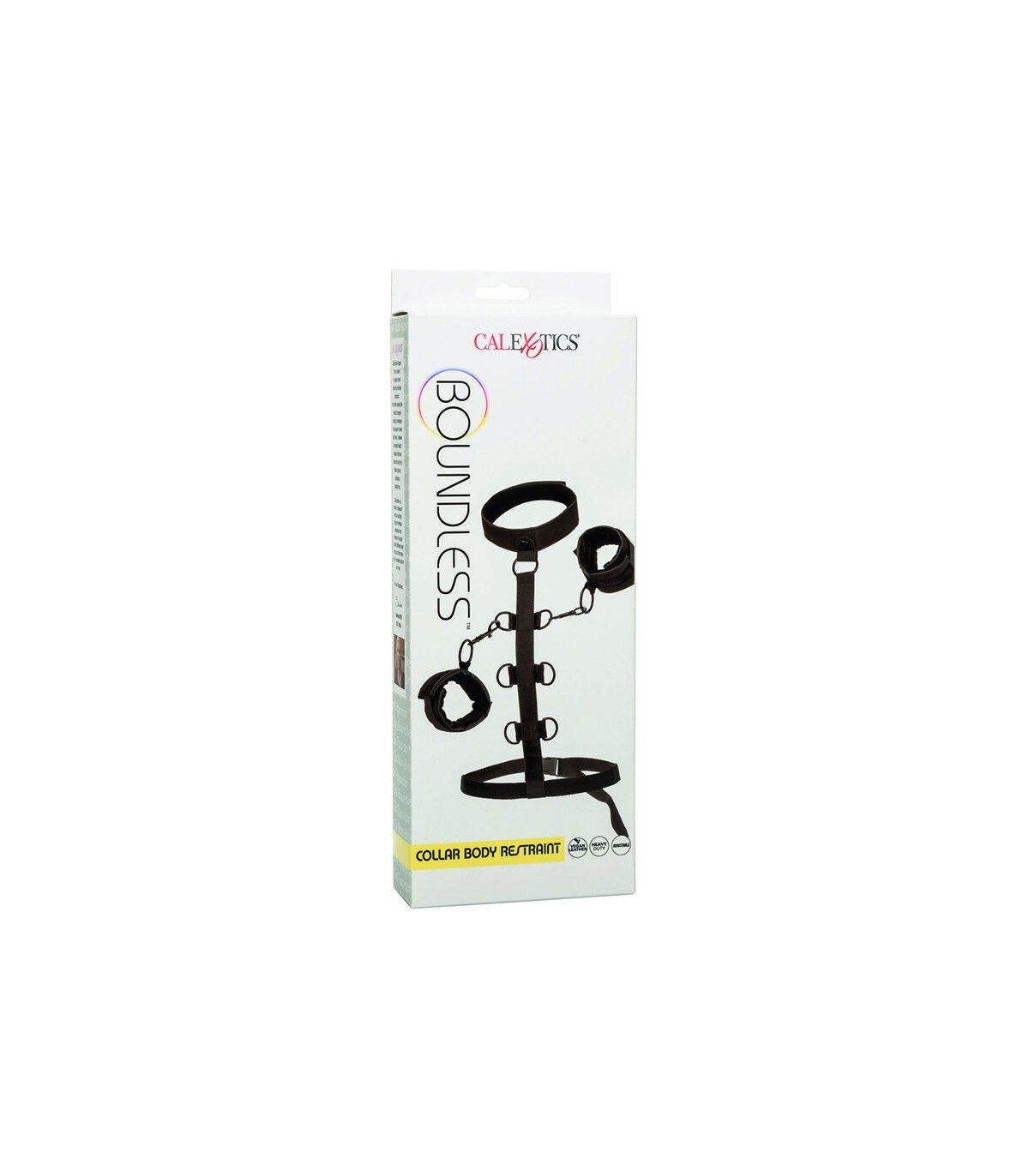 Amplíe los límites del placer y disfrute de infinitas posibilidades de bondage con el sistema de sujeción corporal CalExotics Boundless Collar. Ponte este atrevido sistema de sujeción y explora el juego apasionado con los puños universales de cuero vegano, el cuello resistente y la correa de sujeción de varios niveles. Tanto los fetichistas como los principiantes tímidos pueden disfrutar de un apasionado juego de placer deslizándose en las sujeciones perversamente sexys y los puños acolchados de cuero sintético. Una vez que hayas envuelto este hermoso collar pecaminoso alrededor de tu cuello, tu dominante se deleitará en usar los múltiples niveles de restricciones para comandar y controlar tu placer. Los puños de cuero vegano de felpa están equipados con un cierre universal de alta resistencia con un diseño giratorio para brindarle a su placer un rango completo de movimiento. Además, los puños desmontables se pueden usar de forma independiente para más aventuras. Incluso a los más nuevos en el juego sumiso les encantará la emocionante comodidad de la lujosa capa interior del cuello y el diseño de doble acolchado y doble costura del puño. Haz realidad tus sueños más eróticos y sumérgete en tus deseos más aventureros con este collar de sujeción corporal sensacionalmente cómodo.