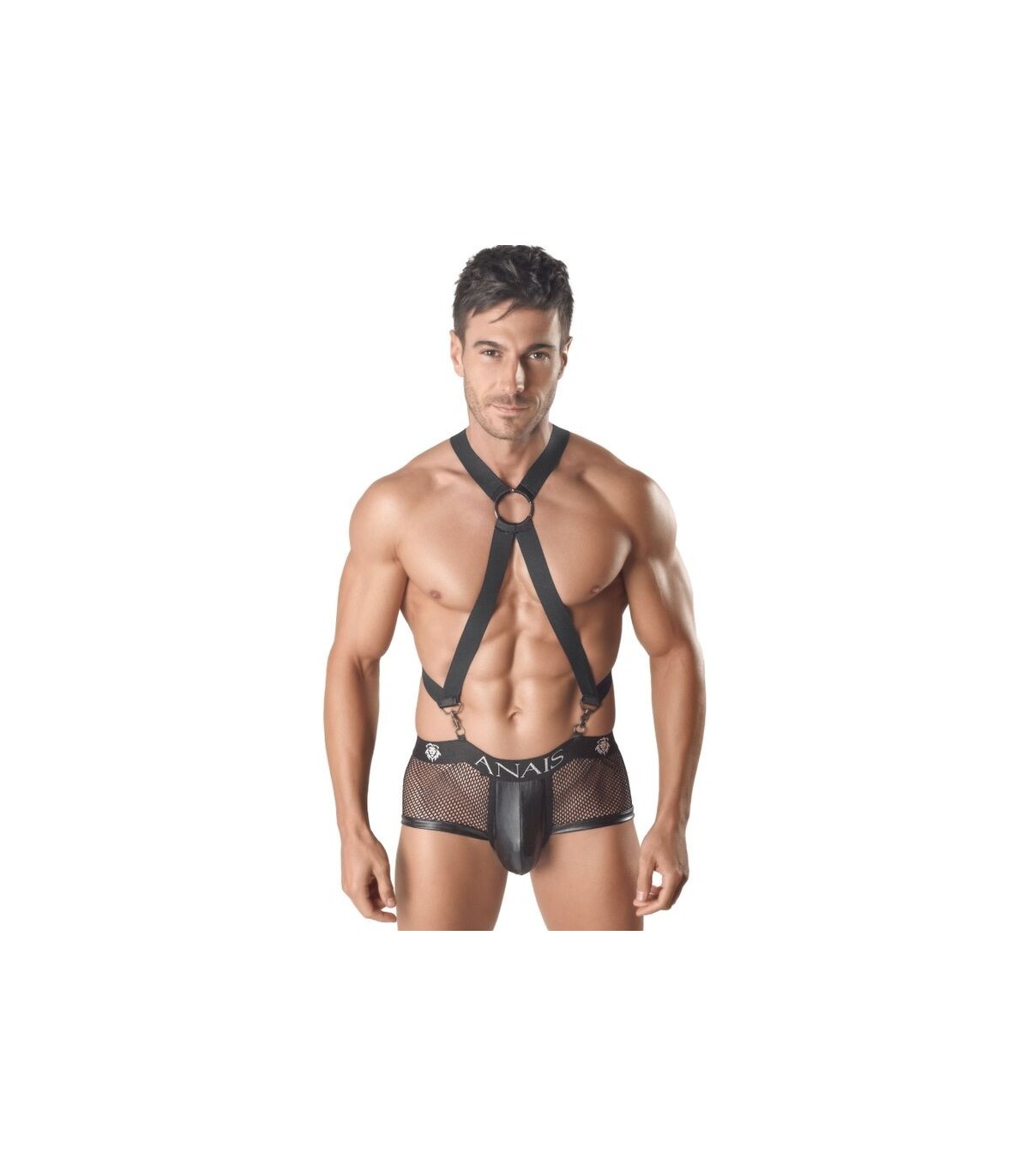 Un arnés masculino para el cuerpo es una pieza de lencería o accesorio que ha evolucionado más allá de su función inicial en el ámbito de la moda íntima, transformándose en una expresión de estilo y sensualidad. Este particular arnés, de un elegante color negro, fusiona diseño y funcionalidad de manera única.