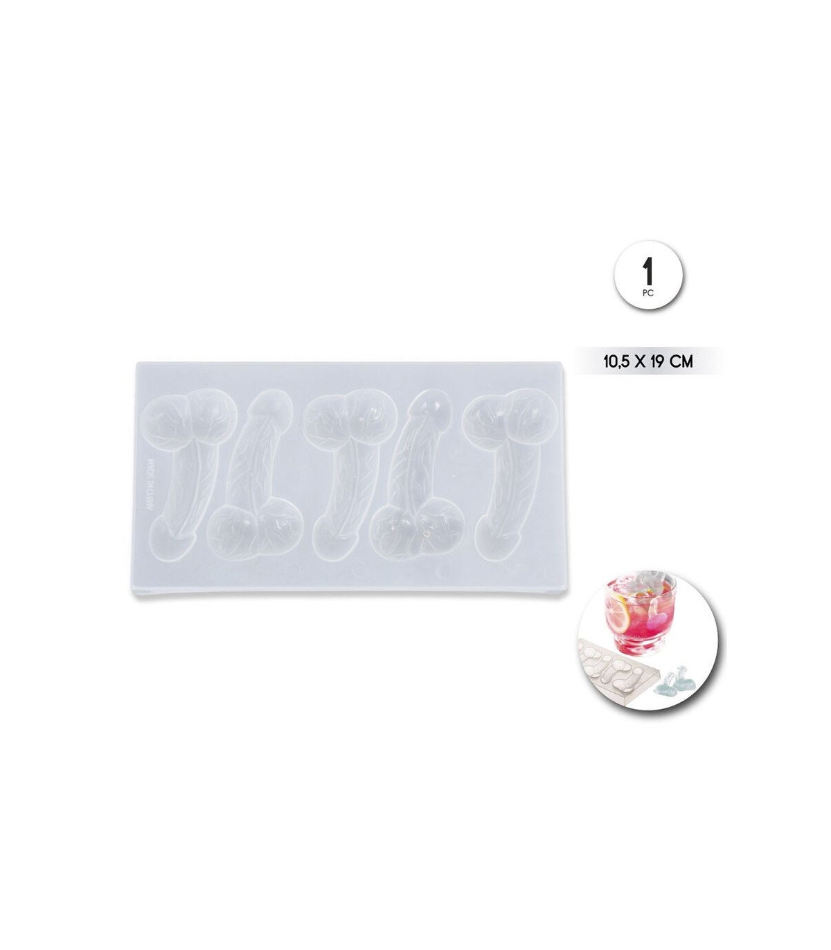 Molde de silicona con 5 cavidades en forma de pene, ideal para hacer hielos, gelatinas o bombones con un diseño divertido y picante. Fabricado en silicona flexible y reutilizable, es perfecto para fiestas de despedida de soltera, cumpleaños adultos o eventos con temática atrevida.
