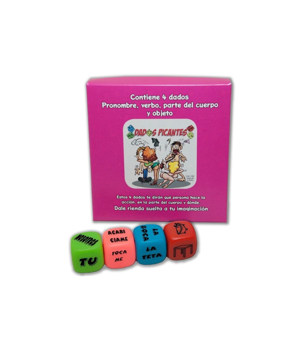 Es una cajita muy divertida y muy chula con 4 DADOS FLUORESCENTE DE COLOR AMARILLO-VERDE-ROSA-AZUL DE 25 mm de DE PRONOMBRE, VERBO Y PARTE DEL CUERPO. Estos dados te dirán la acción que debes hacer en la parte del cuerpo y quien lo debe hacer y donde. TIRA LOS DADOS. HAY 36 COMBINACIONES POSIBLES.