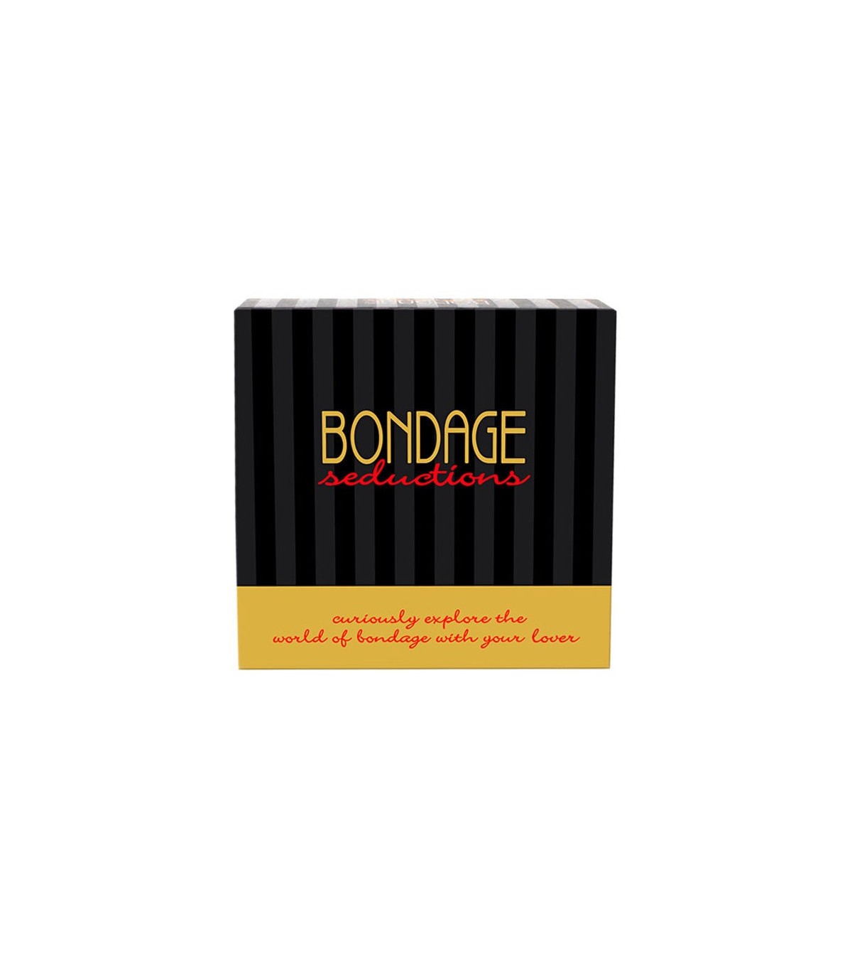 Contiene 36 tarjetas de Bondage Seduction, 2 cuerdas de seda, 2 dados, 1 vendaje para los ojos, 1 látigo de goma y las instrucciones.