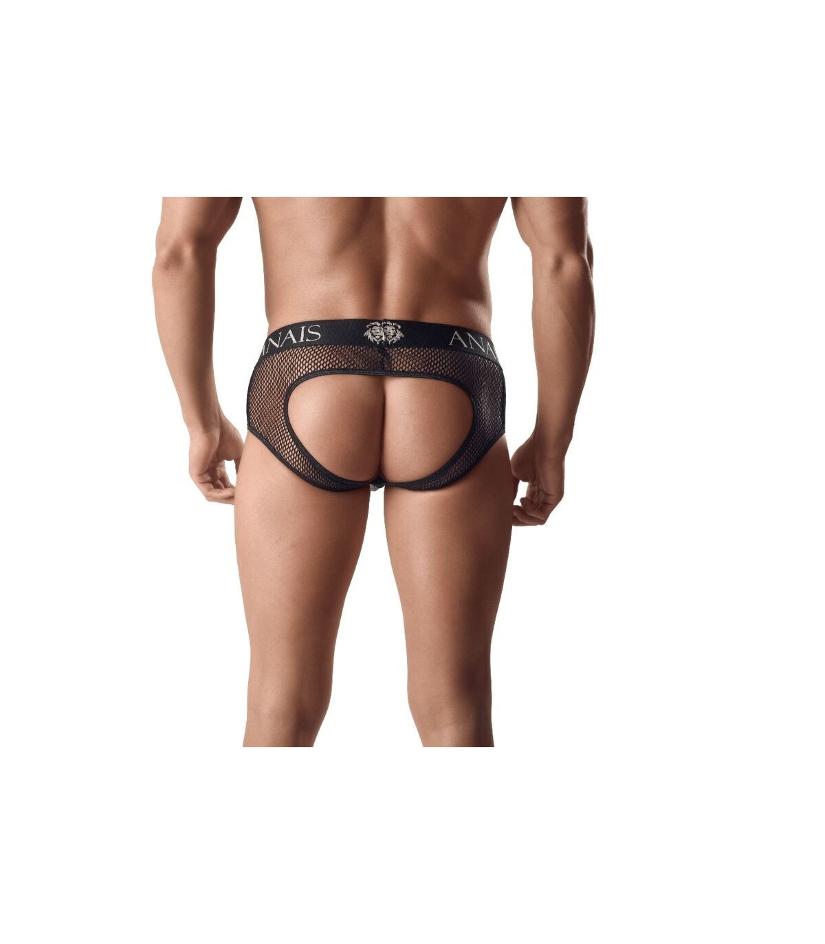 Jock bikini, de red y cuero, color negro y trasero al descubierto