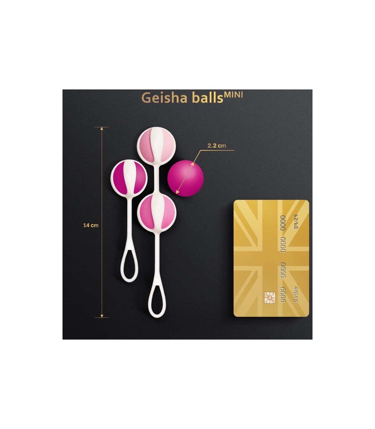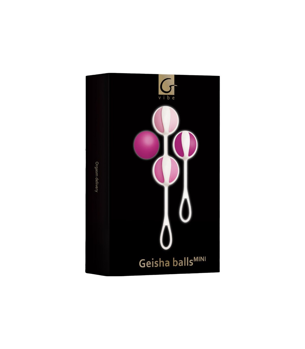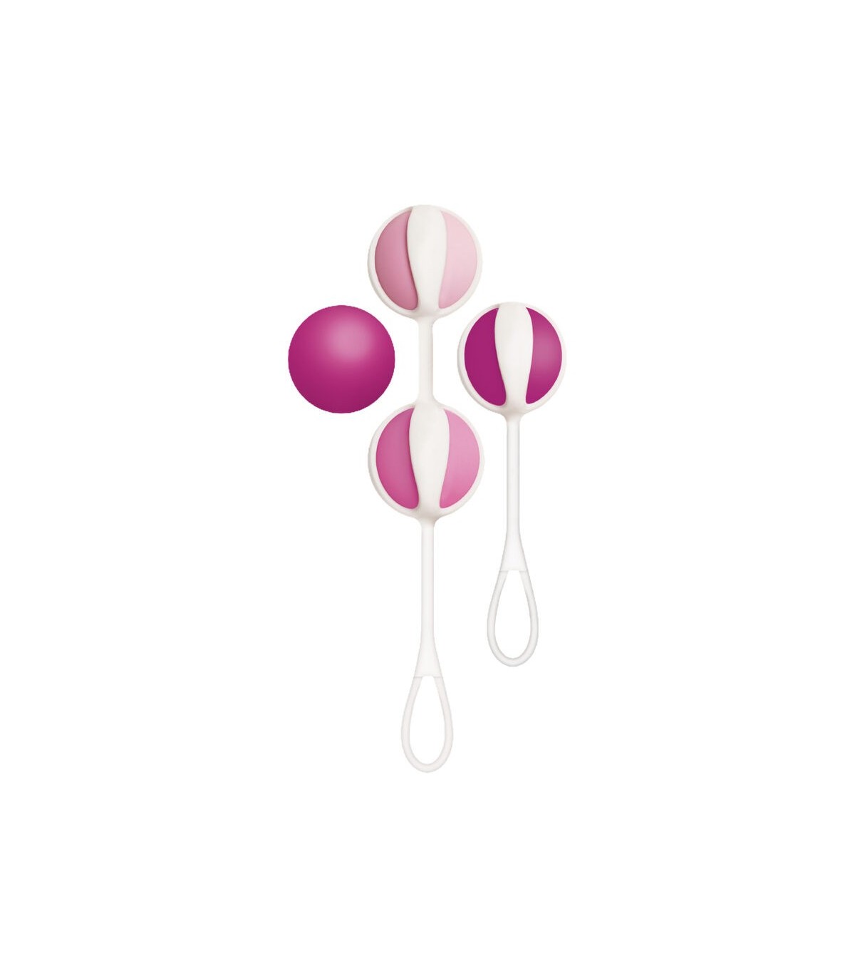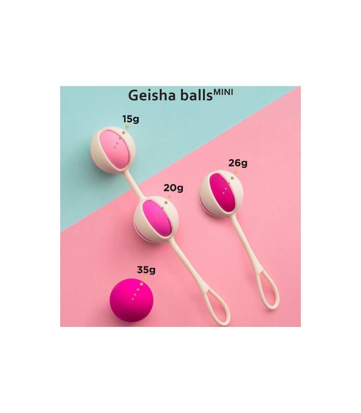Set de 4 bolas Geisha con colores y pesos diferentes. Cuenta con dos fundas de silicona con tiras de silicona flexible para una cómoda extracción. Podrás combinar todas las bolas tú quieras y ejercitar tu suelo pélvico a tu ritmo.