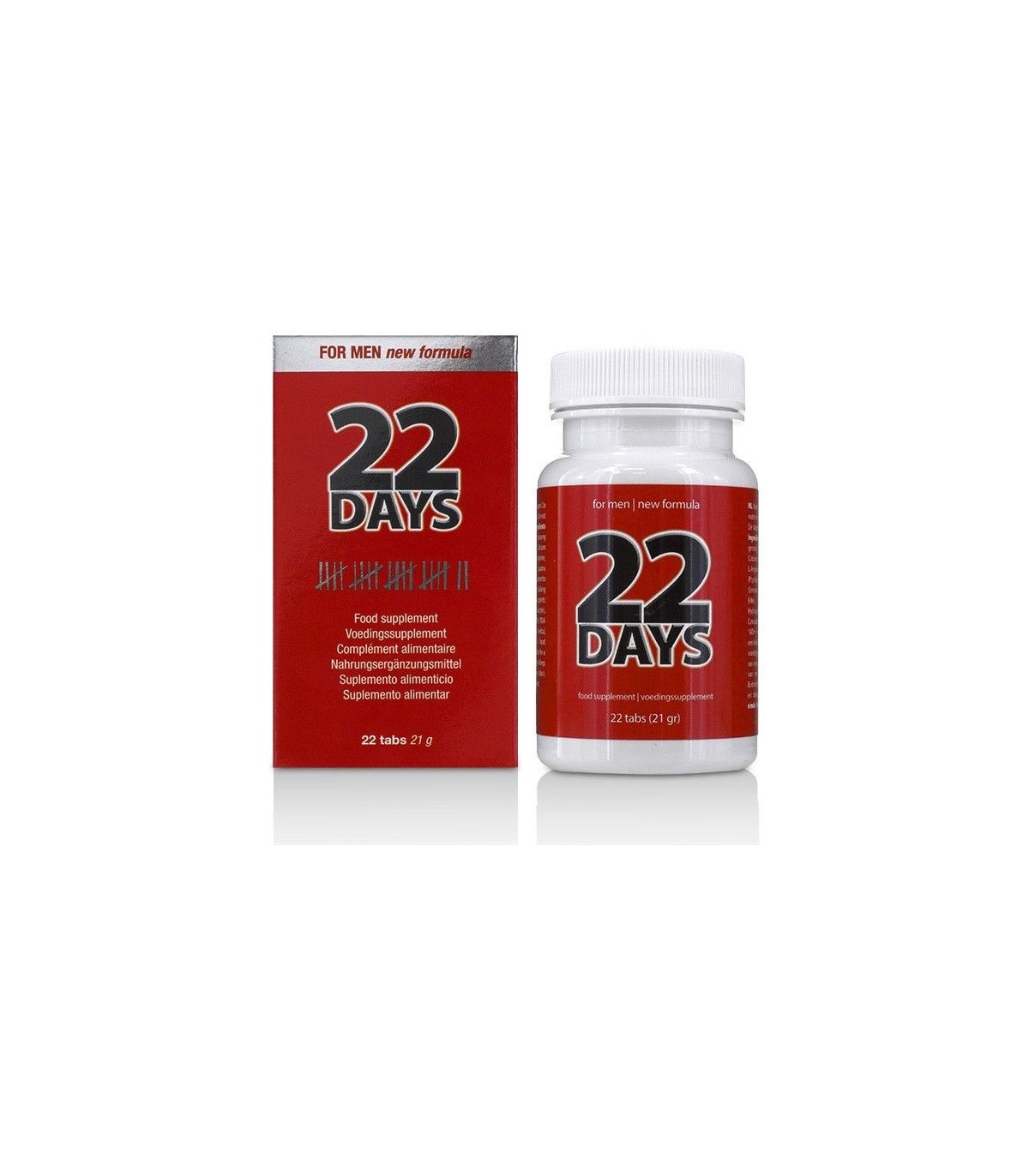 22 Days PE es un complemento alimenticio en cápsulas diseñado para favorecer la vitalidad masculina. Su fórmula a base de vitaminas y extractos vegetales estimula la circulación sanguínea, contribuye al buen funcionamiento de los órganos sexuales y apoya la actividad hormonal, ayudando a reforzar la potencia, la fuerza y la libido.