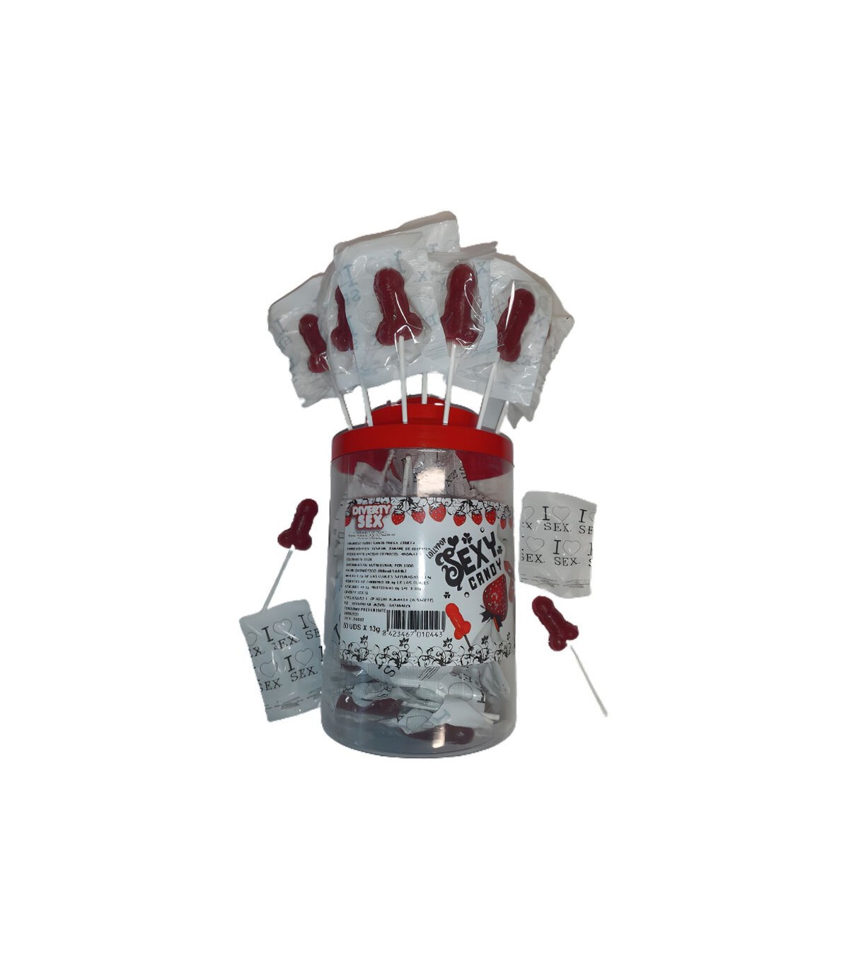 BOTE EXPOSITOR CON 50 PIRULETAS CON FORMA DE PENE DE CARAMELO CON SABOR A FRESA Y CEREZA