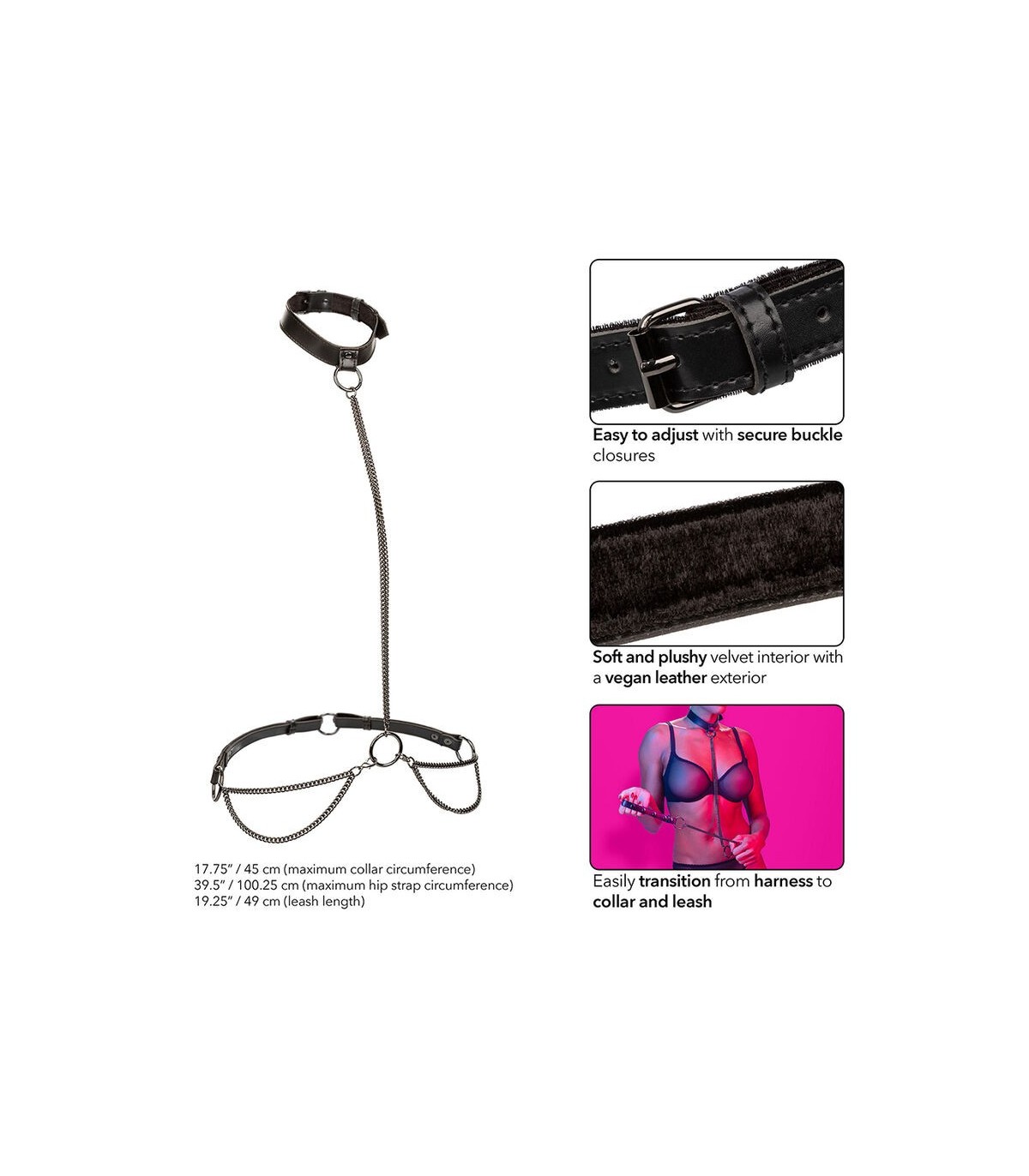 El arnés de múltiples cadenas se transforma sin problemas en un collar y correa imperativos, dirigido a los audaces, hermosos e intrépidos.
