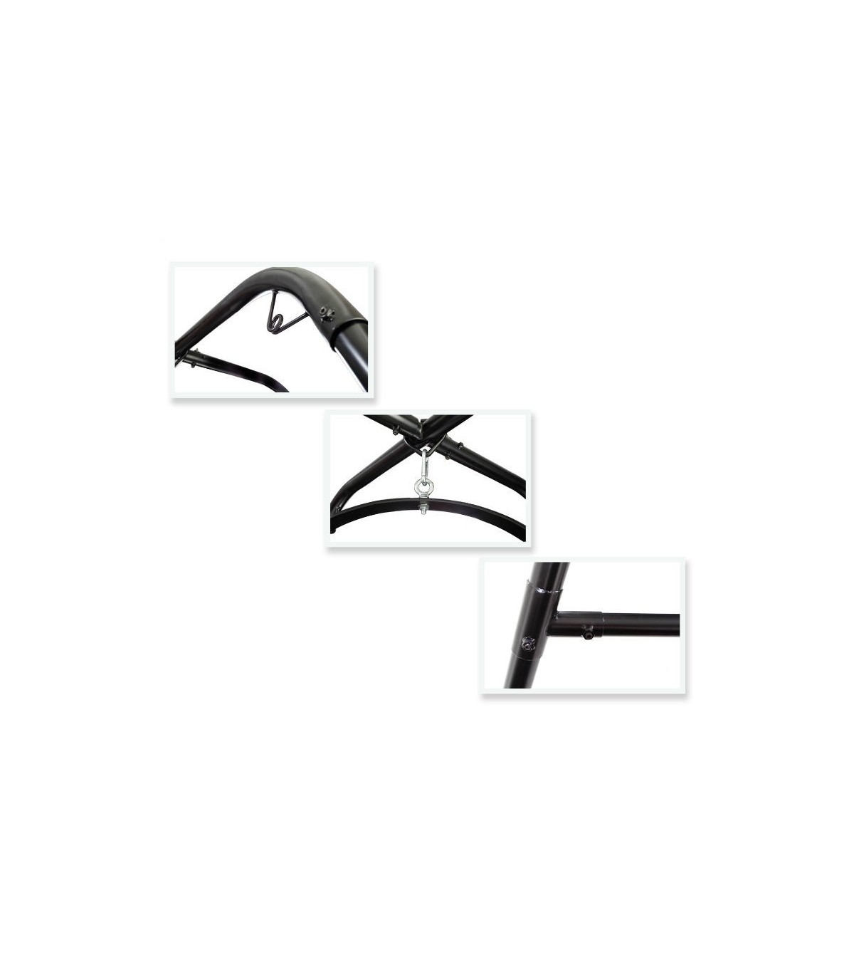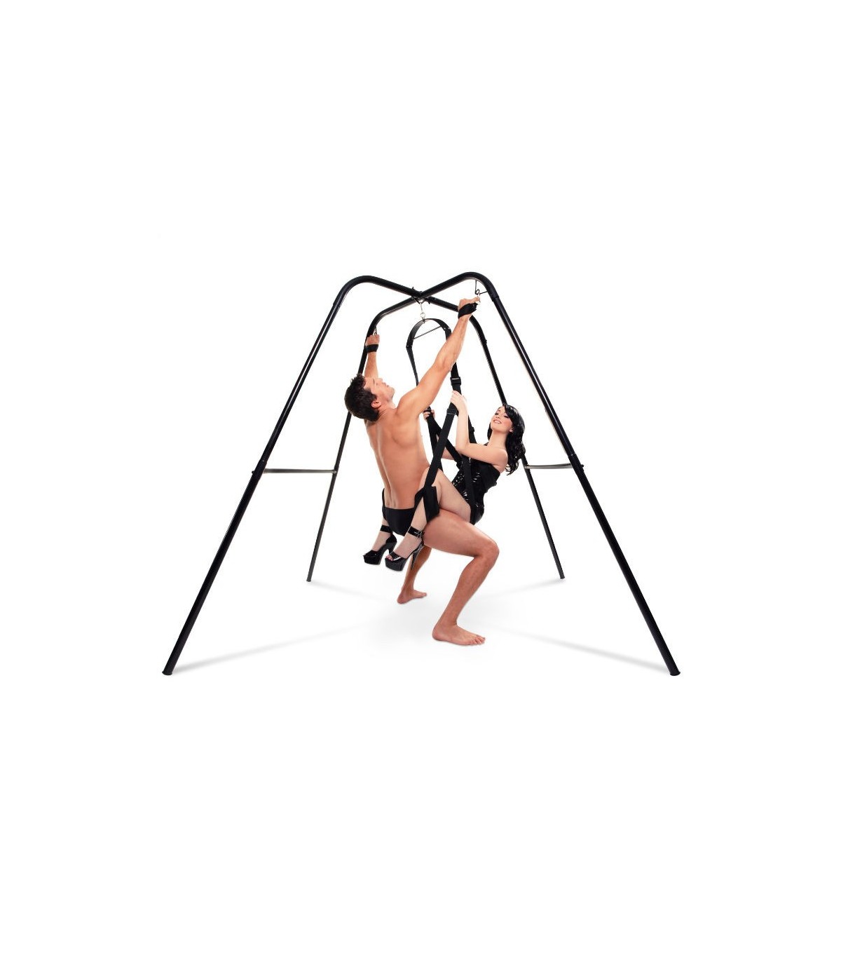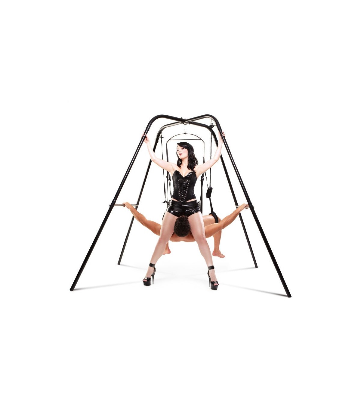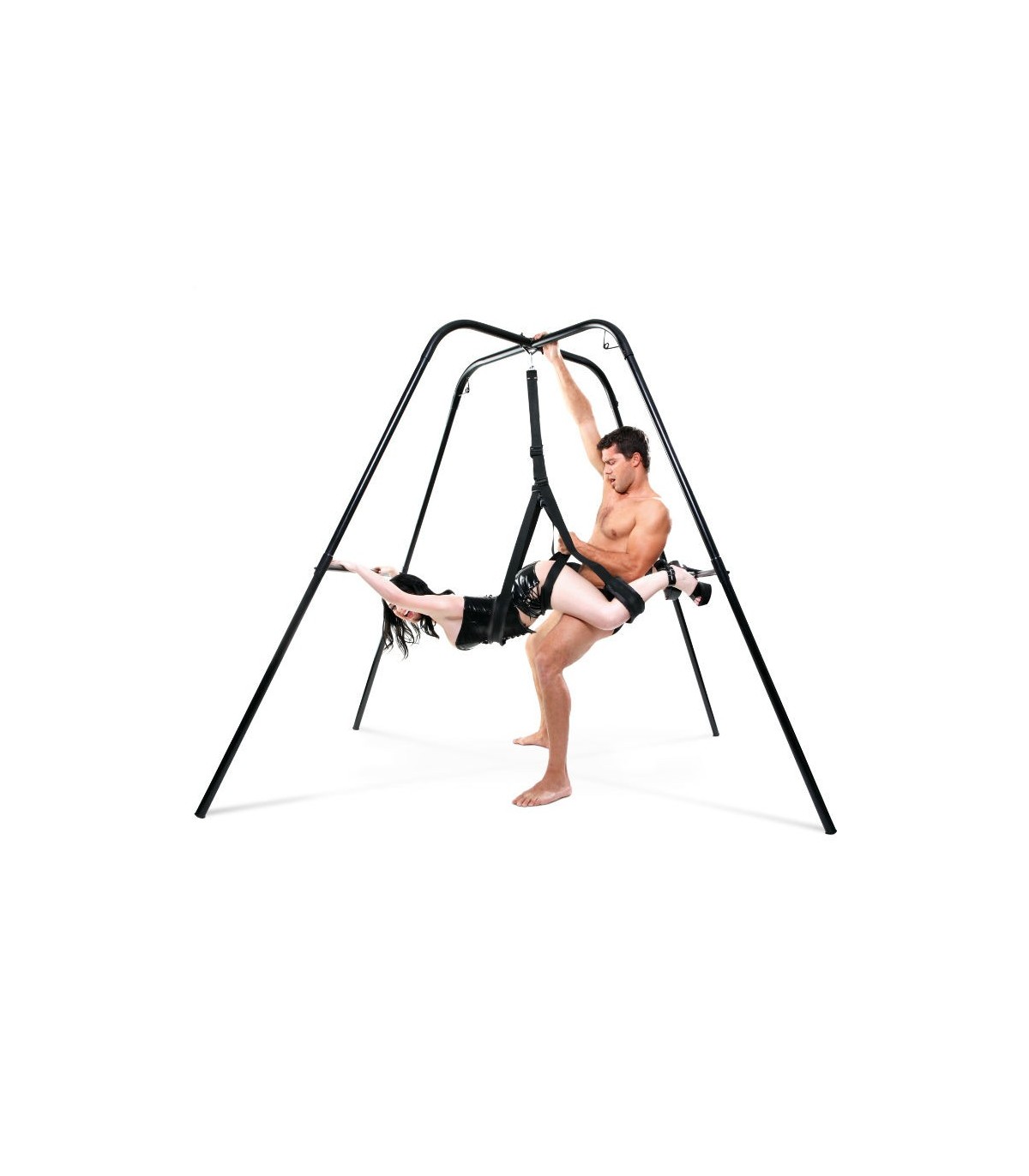 Convierte cualquier habitación en tu cuarto de juegos bondage con el increíble Fantasy Swing Stand. No se preocupe por la perforación de agujeros en el techo nunca mas. Este soporte aguanta mas de 400 lbs. Posee una gran estabilidad y te permitirá libertad de movimientos, dejándote explorar nuevas posiciones que nunca hubieses creído posibles. Se monta rápida y fácilmente, en menos de diez minutos y no necesita herramientas adicionales . Una vez montado puedes usarlo con toda su variedad de Fetish Fantasy Bondage restraints como esposas y cuerdas para crear nuevos escenarios bondage. Las posibilidades son infinitas. Esta estructura posee ayuda para intentar nuevas posturas en el columpio. Ambos pueden usar las barras y barras transversales para ayudar a alzarse y mantener el equilibrio. Sin el columpio conectado a la estructura, esta puede servir para inmovilizar a tu pareja.