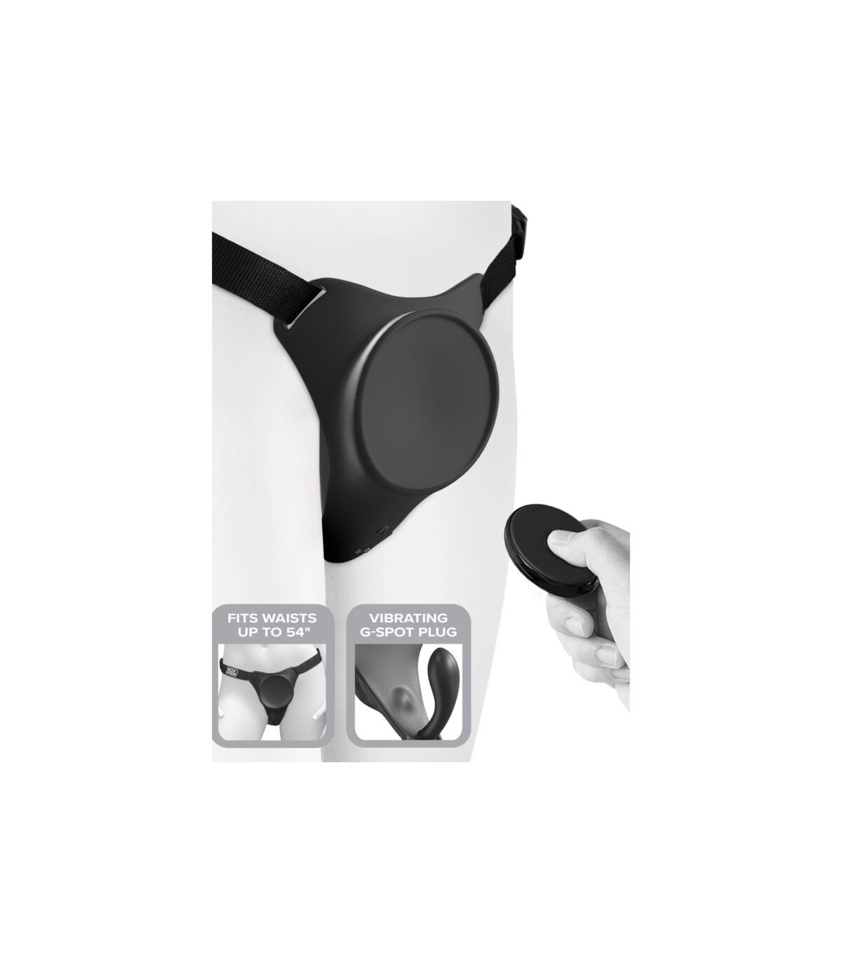 - Cuenta con una placa de cuerpo de silicona vibrante con conector G-Spot, respaldo acolchado, hebillas ajustables, control remoto recargable y cable de carga USB