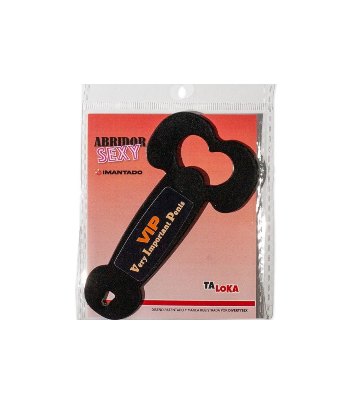 Blister con un fantastico abridor metalico imantado de color negro en forma de pene con corazon, con frases muy divertidas recuerdo de la fiesta. Para abrir la pasion del mas apasionad@.