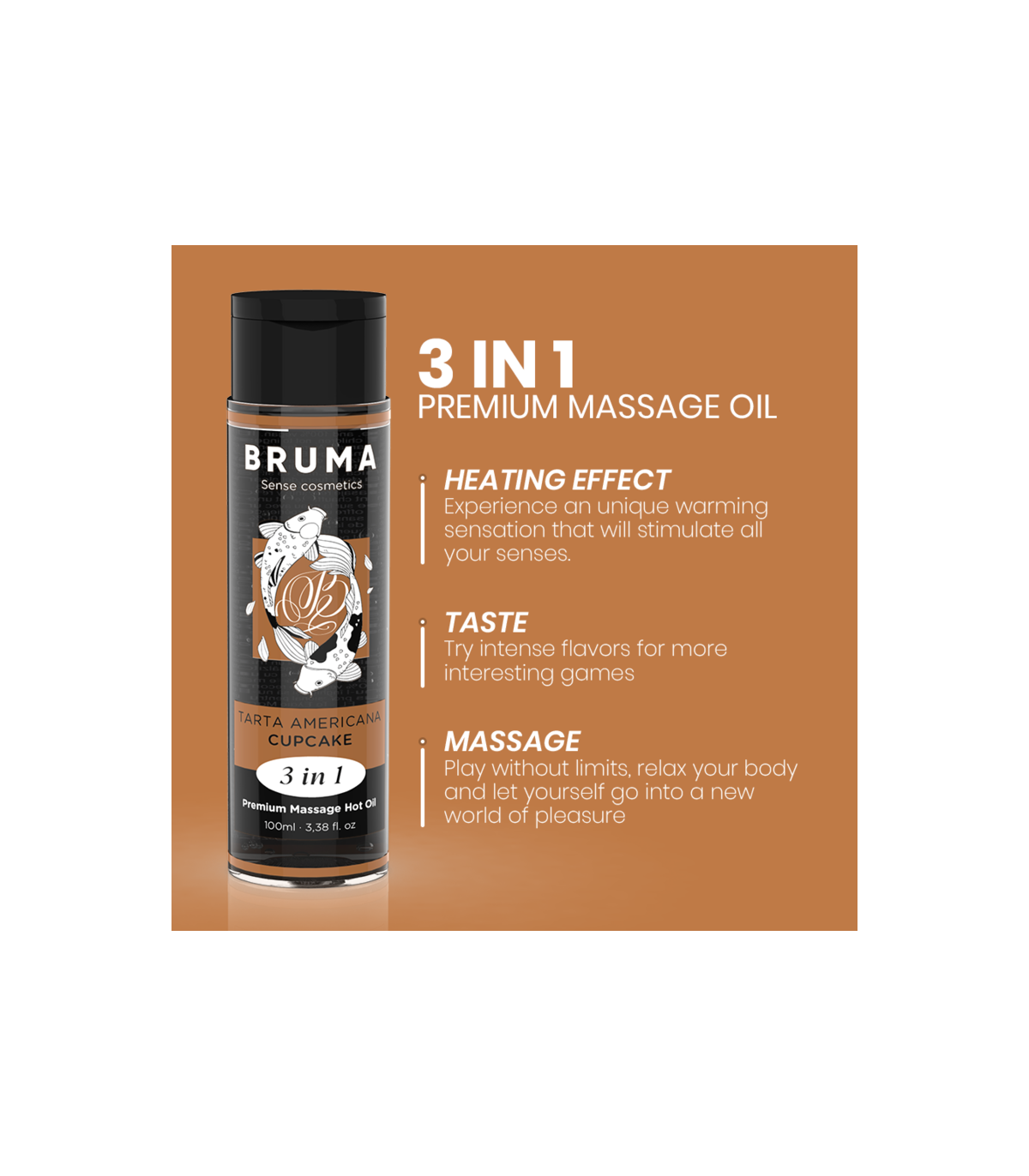 El Aceite de Masaje Premium Efecto Calor con sabor a Tarta Americana de la marca BRUMA es una auténtica joya en el mundo del bienestar y la intimidad. Este exquisito producto, presentado en un elegante envase de 100 ml, está diseñado para proporcionar una experiencia única y sensual, brindando un masaje relajante y estimulante con un toque de calidez que lo hace aún más especial. Aquí están los puntos destacados desarrollados en detalle: