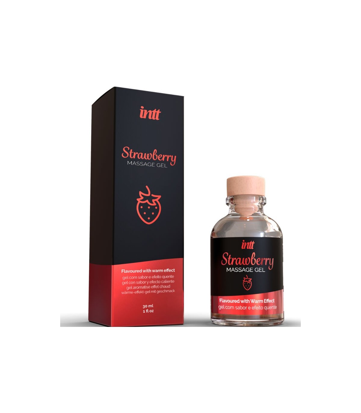 Massage Gel Strawberry de INTT es un gel de masaje con aroma y sabor a dulce fresa que añade un agradable y cálido efecto calor.