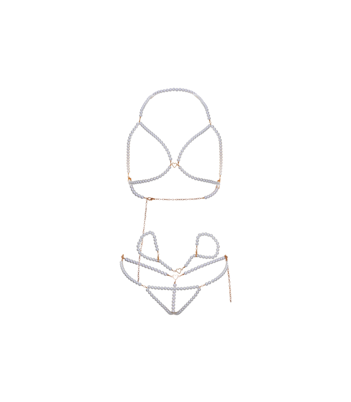 Mímate con nuestro seductor conjunto de lencería de 3 piezas confeccionado en perlas de imitación, que presenta un sujetador de copa abierta y un cordón con cierres de cadena ajustables. El conjunto está adornado con sensuales detalles en forma de corazón, que añaden un toque de romance a tus momentos íntimos. Para completar la emoción, se incluyen muñequeras a juego. Este conjunto es perfecto para quienes buscan estilo y emoción. Siéntete segura e irresistible con esta exquisita lencería.