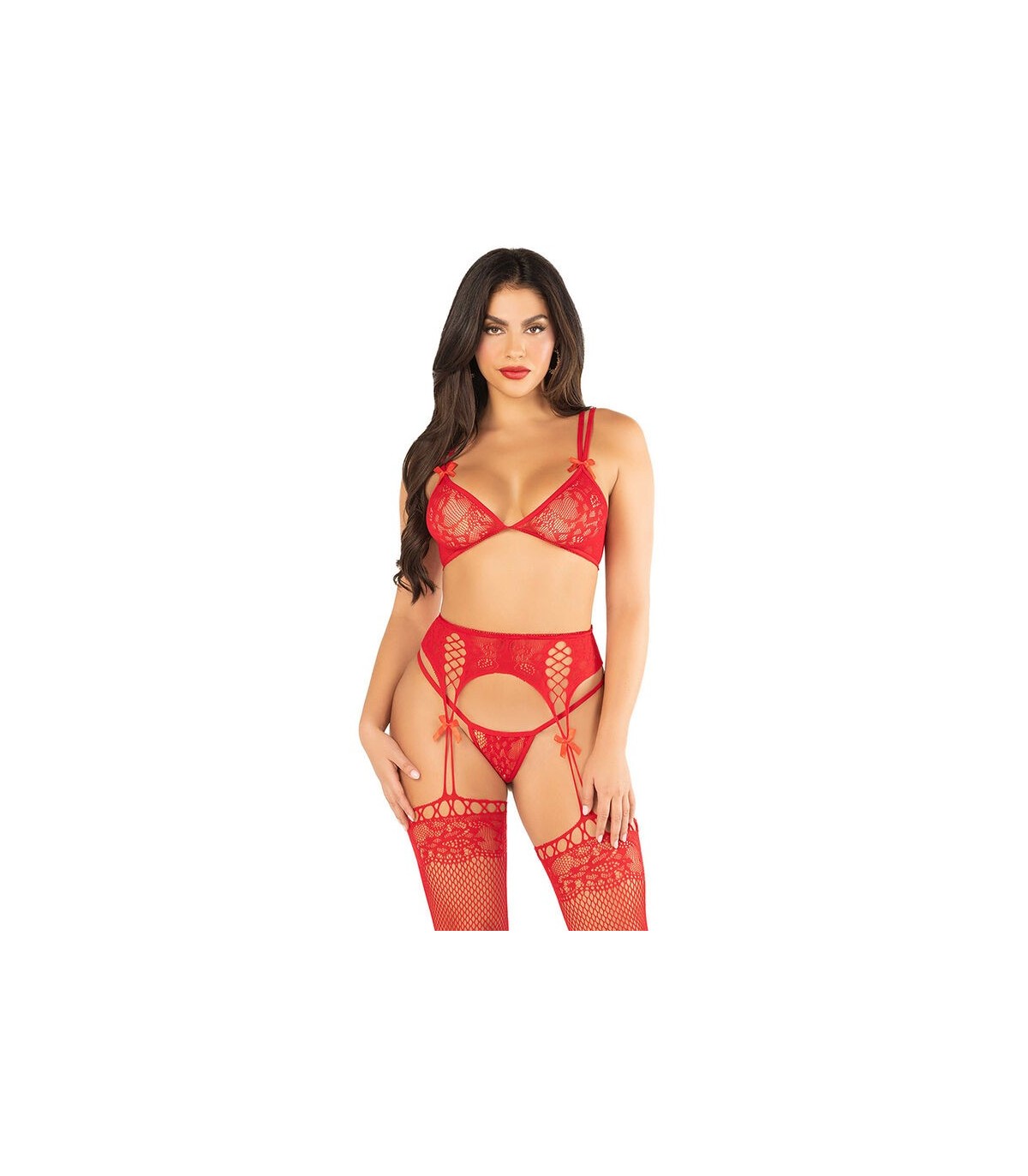 Eleva tu estilo con este Conjunto de Sujetador, Tanga y Medias de Rejilla en Rojo, diseñado para resaltar tu lado más atrevido y sofisticado.