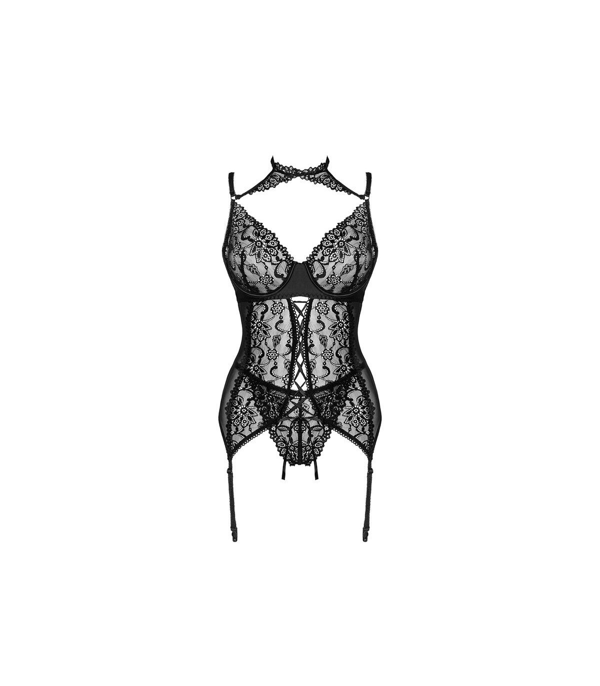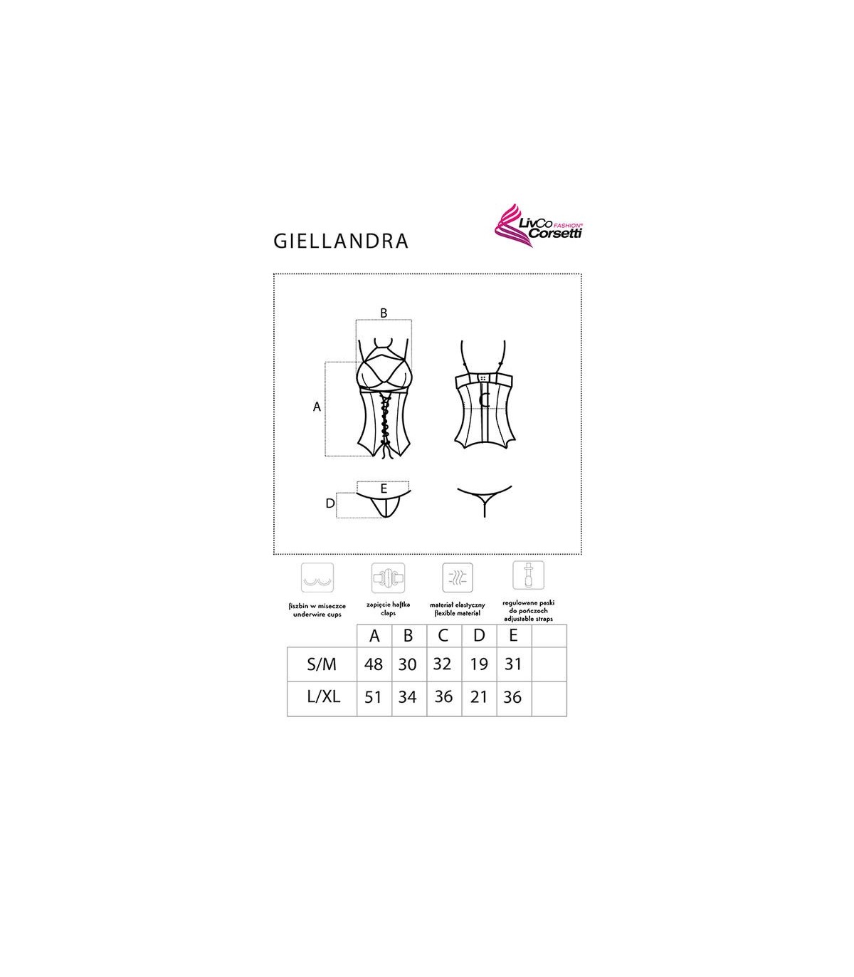 El corsé para los sentidos Giellandra es un conjunto de la lujosa marca polaca LivCo Corsetti Fashion que consta de 2 elementos: un corsé y un tanga. La ropa interior es del clásico color negro. El corsé se sujeta con ganchos, lo que permite el ajuste y garantiza comodidad. También es posible ajustar la longitud de los tirantes y colocar medias, lo que diversificará enormemente el estilo. Se trata de una propuesta perfecta para las mujeres que valoran la comodidad, pero no quieren renunciar a una apariencia sensual. La ropa interior está hecha de 90% poliamida y 10% elastano. Esta combinación de materiales hace que el conjunto sea muy flexible y no restringe el movimiento. El juego incluye inserciones decorativas de encaje resistente que realzan las formas femeninas en los lugares más importantes. El corte y el ribete en el vientre hacen que el corsé sea sofisticado y al mismo tiempo deja espacio para la imaginación. Un elemento inusual es una gargantilla que llamará la atención sobre el cuello y la clavícula. Este corsé sexy sin duda animará muchas veladas románticas.