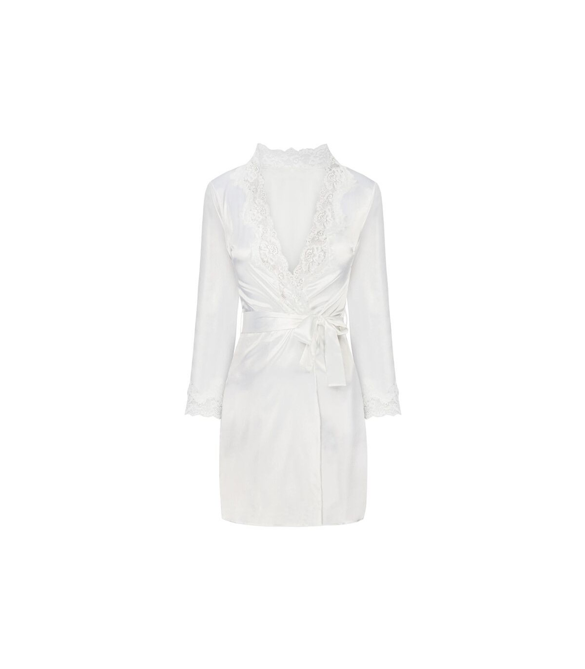 Un conjunto de ropa interior excepcionalmente hermoso hecho de satén crudo brillante, una bata de baño con camisola que llega hasta la mitad del muslo. La parte delantera y las mangas largas de la bata, atadas a la cintura con un cinturón, están decoradas con un bonito encaje. Camiseta de tirantes finos ajustables, decorada con el mismo encaje en el busto. Tanga incluida.