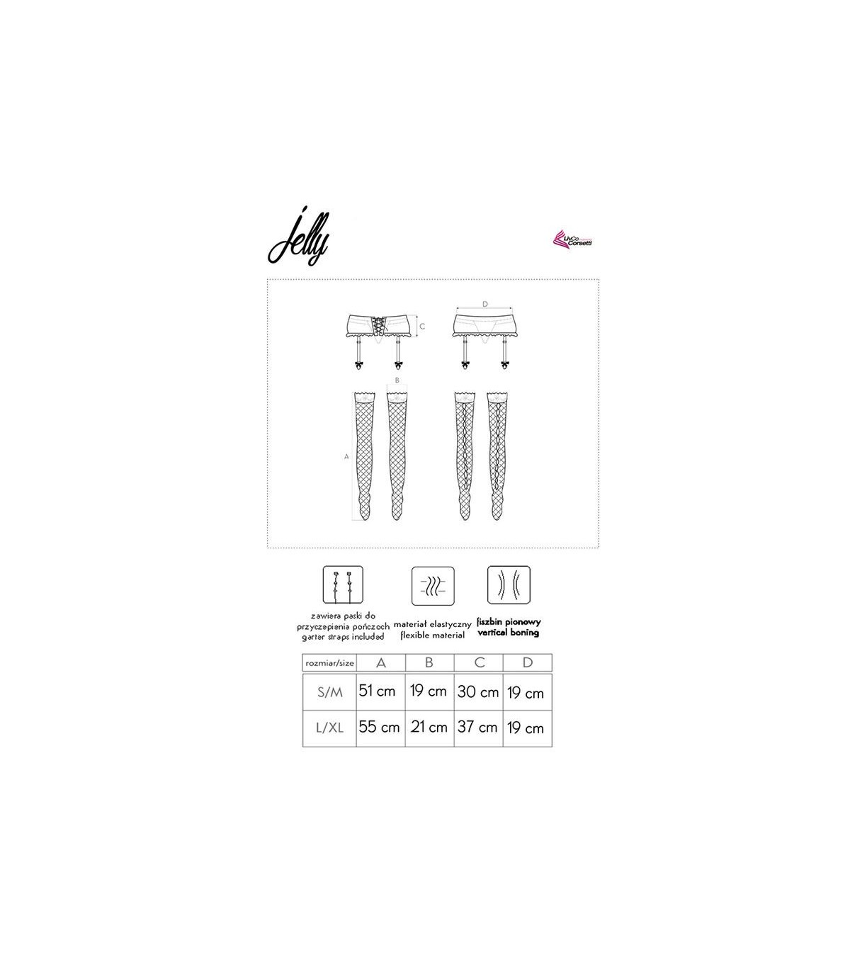 El liguero Jelly es un sensual conjunto de ropa interior de la colección LivCO Corsetti Fashion. Incluye liguero con medias. Todo está acabado en un elegante color negro. El liguero está hecho de encaje fino. Cubre el cuerpo desde las caderas hasta la cintura. Su anchura hace que parezca muy impresionante y moldea ópticamente la figura. El cinturón también tiene costuras verticales que le dan un carácter depredador y lo estilizan ópticamente. Los tentadores adornos en forma de inserciones diagonales de material brillante están adornados con elementos decorativos plateados. La parte delantera del liguero se cierra con cómodos ganchos. La atractiva espalda con abertura por encima de las nalgas está equipada con un cordón tipo corsé. Las medias de rejilla con malla grande se sujetan a la cintura con tirantes finos y ajustables. Su parte superior está decorada con encaje con adorno floral. El conjunto está fabricado en material flexible que se adapta a la forma del cuerpo y realza la figura.