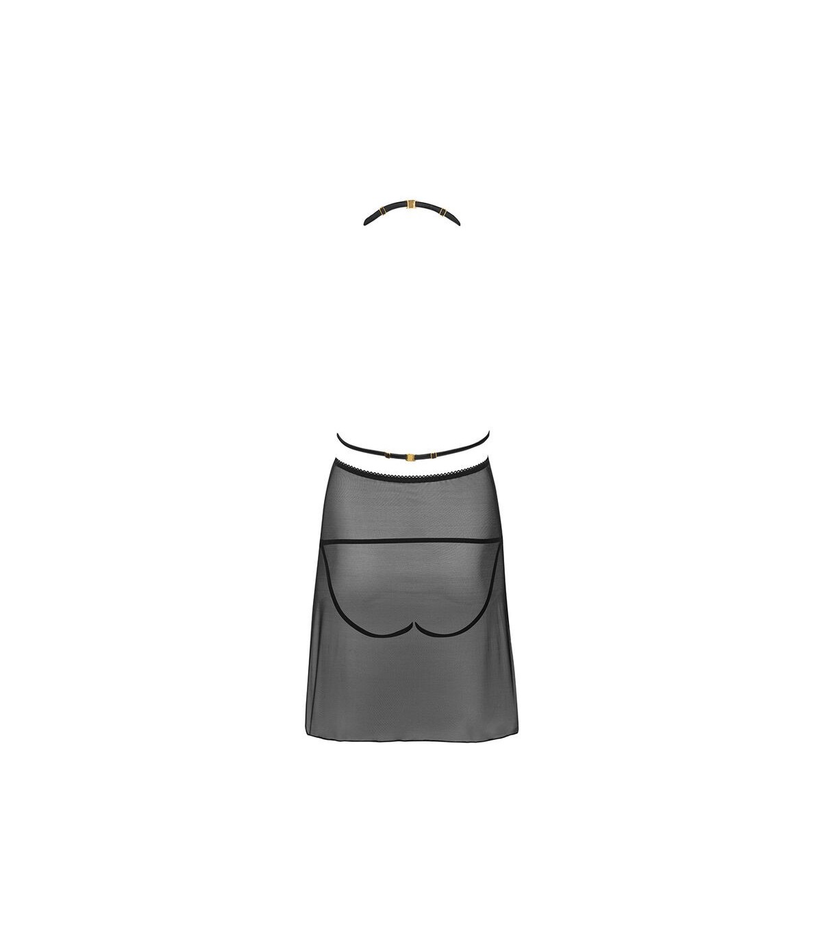 La camiseta del conjunto Malviami es una impresionante combinación de materiales clásicos, con tirantes sensuales y depredadores que sostienen el busto y le dan carácter. La parte superior del conjunto está hecha de encaje femenino y la parte inferior es de malla densa, que llega hasta la mitad del muslo. La camiseta es escotada tanto por delante como por detrás. Debajo del material semitransparente se puede ver un tanga de corte original con un inserto de encaje y correas que rodean las nalgas. Gracias al clásico color negro, el conjunto quedará perfecto para cualquier ocasión y ayudará a enmascarar pequeñas imperfecciones de la figura, al tiempo que enfatiza sus ventajas.