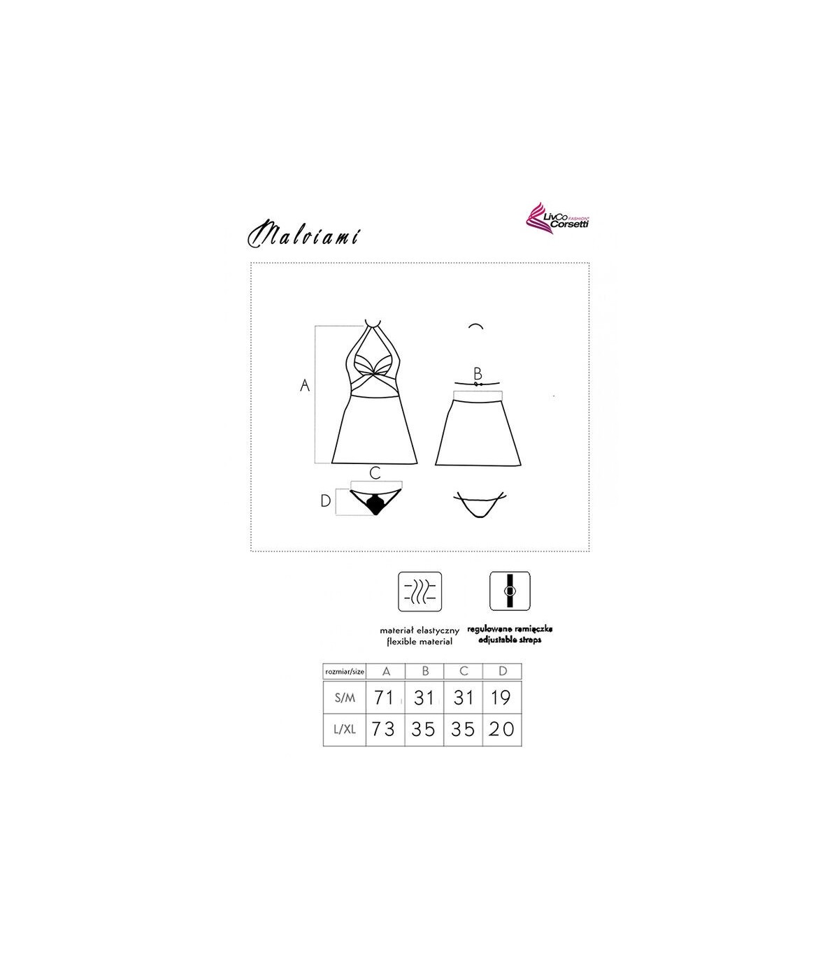 El conjunto Malviami es la elección perfecta para las mujeres que quieren reforzar su confianza en sí mismas y tomar el control. El conjunto se compone de una atrevida camiseta y un elegante tanga en un color negro universal y atemporal. El producto está fabricado con una mezcla de poliamida y elastano, lo que lo hace muy agradable al tacto, flexible y confortable. Se adapta perfectamente a la forma del cuerpo, pero no restringe la libertad de movimiento.