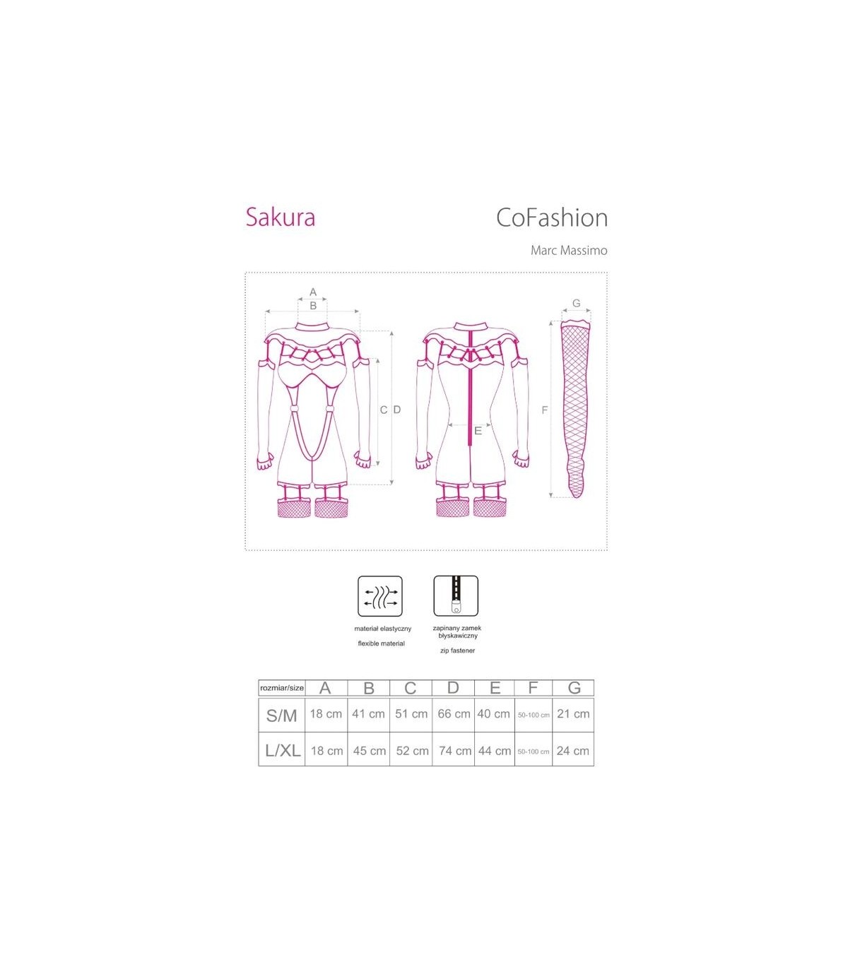 Los accesorios rojos en forma de cordones en la parte superior e inferior lo hacen extravagante. A la altura del vientre, está conectado con dos anillos de metal. Medias de rejilla conectadas al mono con cordones rojos.