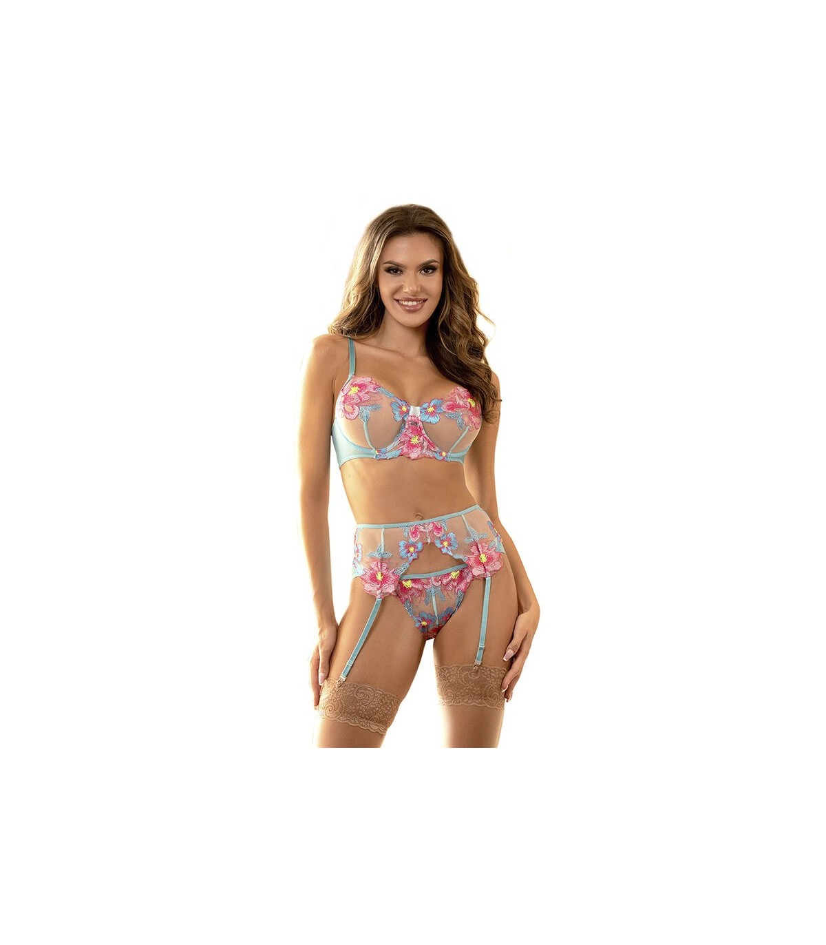 SUBBLIME - 954116 BRA + PANTIES WITH GARTER BELT FLORAL DESIGN BLUE L/XL