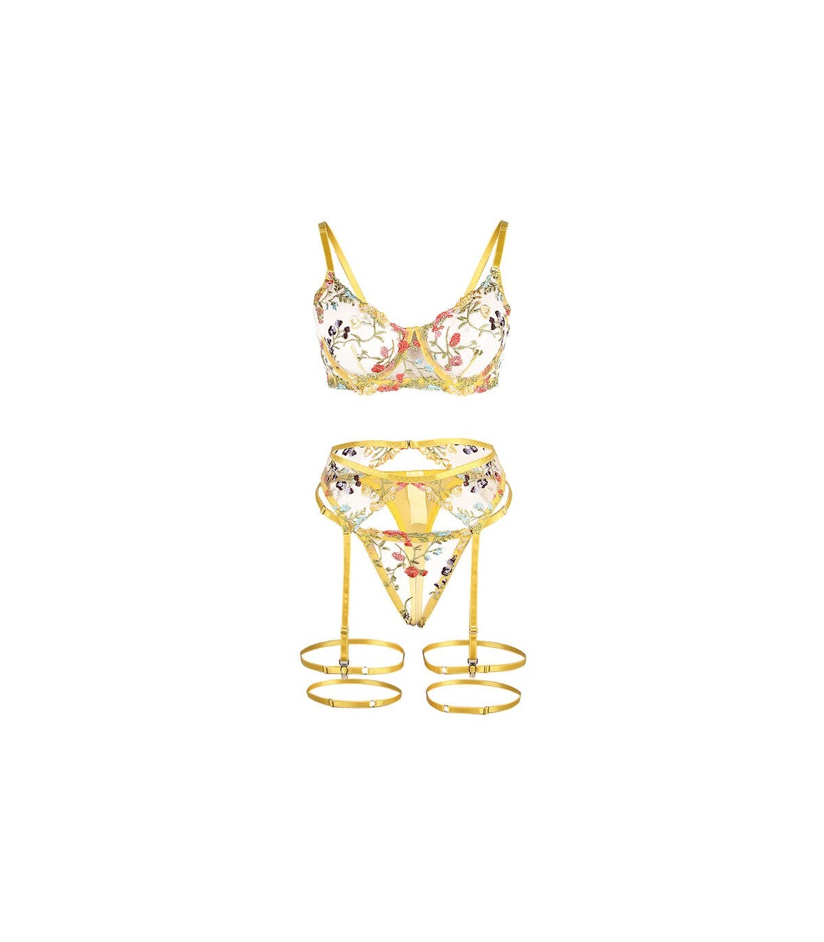 SUBBLIME - 954345 BRA + THONG + GARTER BELT FLORAL DESIGN YELLOW S/M