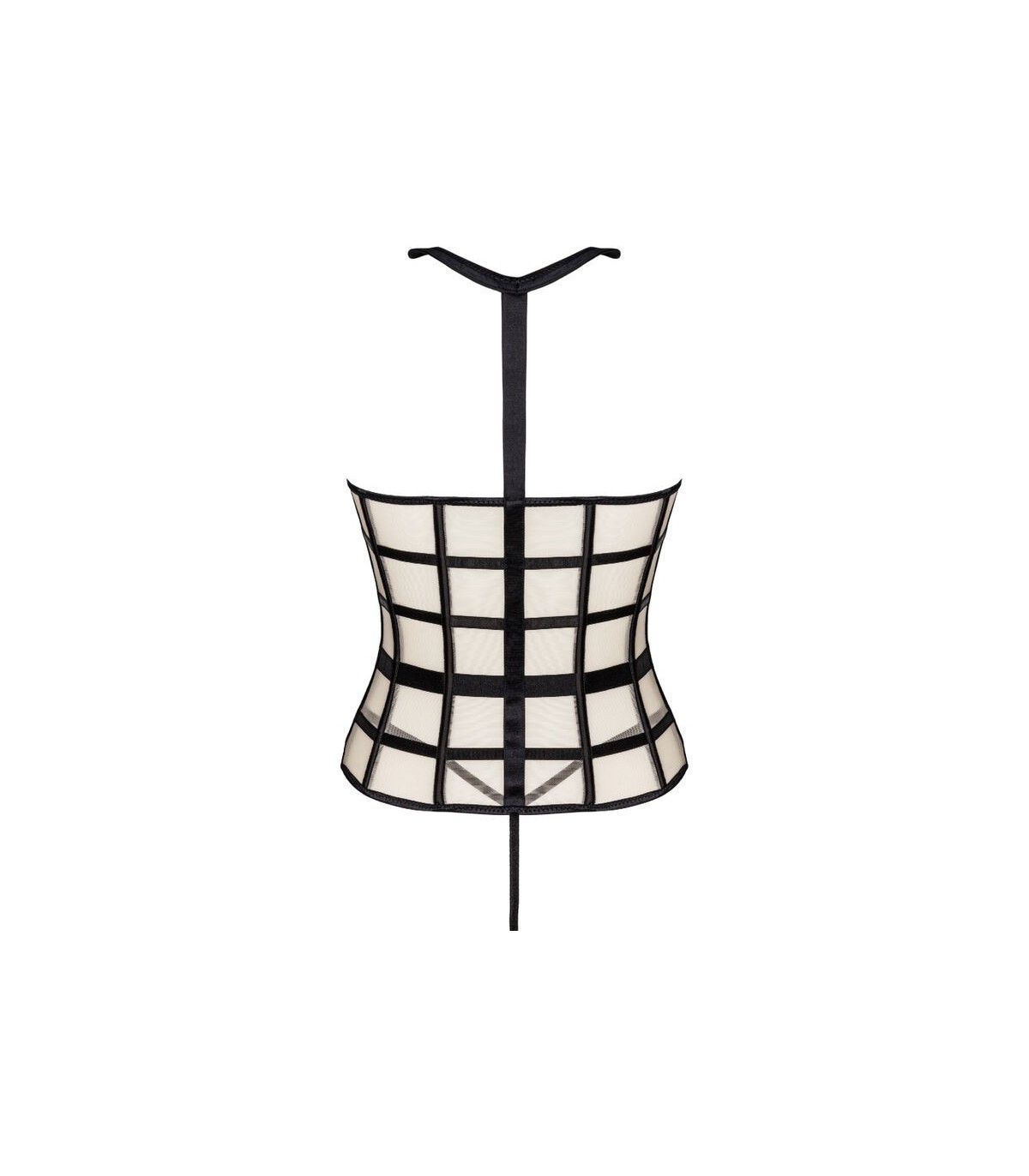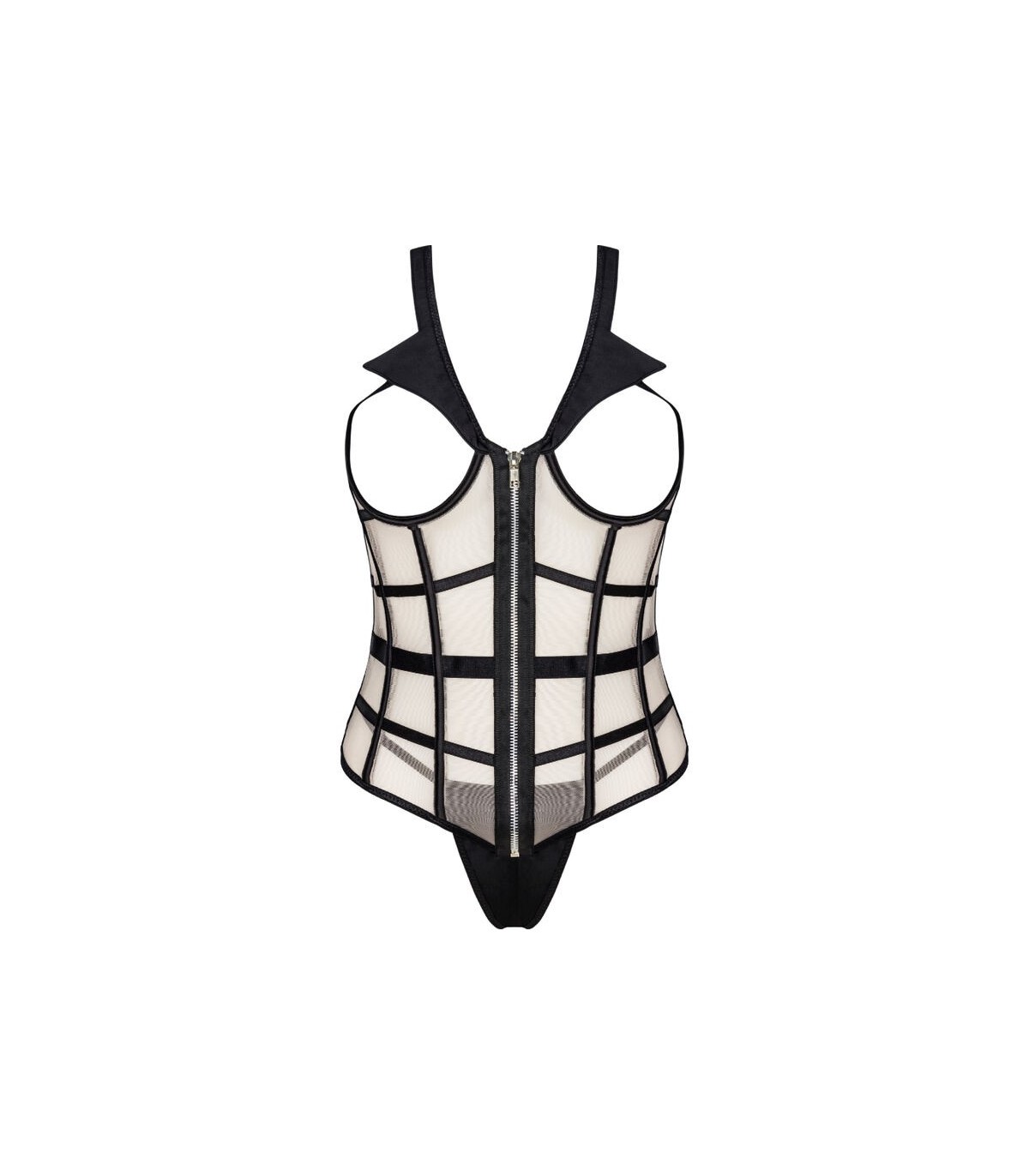 Un conjunto de dos piezas compuesto por un sensual corsé con el pecho al descubierto y un sexy tanga negro. El corsé tiene una cremallera en la parte delantera, lo que facilita su colocación. Los colores del conjunto son el negro y el beige, que juntos crean una atractiva combinación. También vale la pena prestar atención a detalles tentadores como un cuello negro o cinturones negros dispuestos de tal manera que realcen mejor la cintura. Lo que más destaca de este corsé son los recortes que exponen el busto. Esto hace que todo el conjunto sea muy atrevido y provocativo. No queda mucho a la imaginación. Las pegatinas para pezones serán una gran adición al juego y agregarán algo de sabor.