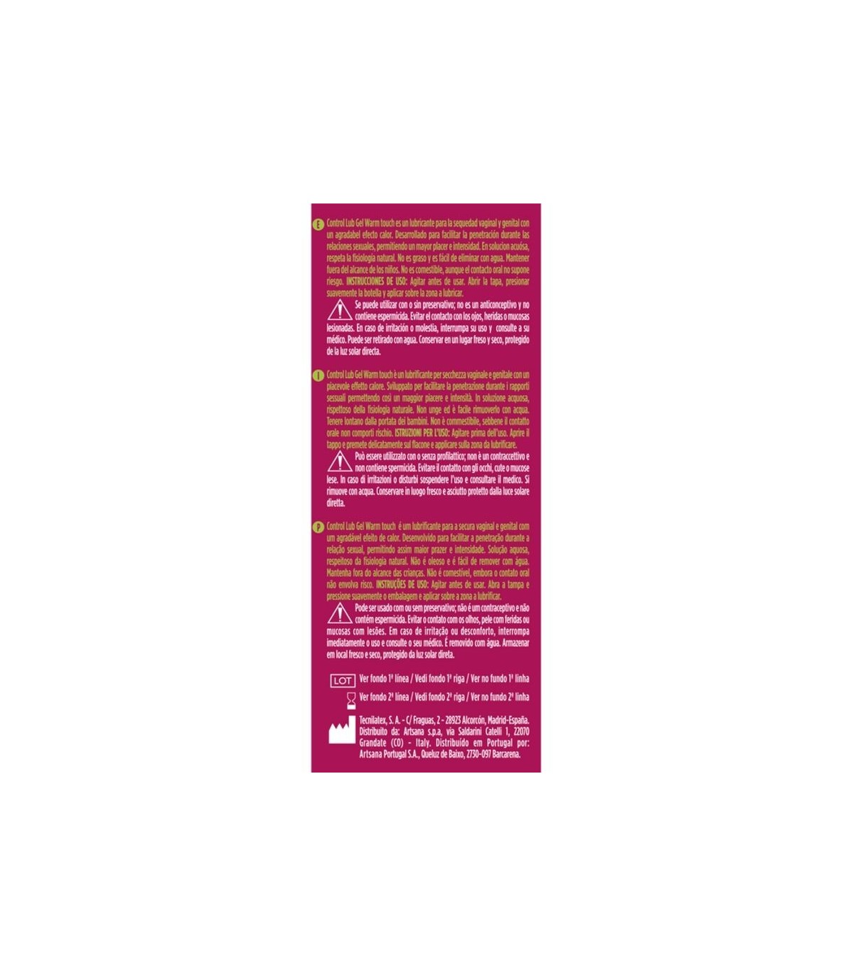 Control Lub Gel Warm Touch es un lubricante para la sequedad vaginal y genital con un agradable efecto calor desarrolado para facilitar la penetración durante las relaciones sexuales permitiendo un mayor placer e intensidad. De base acuosa, respeta la fisiología natural . No es graso y es fácil de eliminar con agua