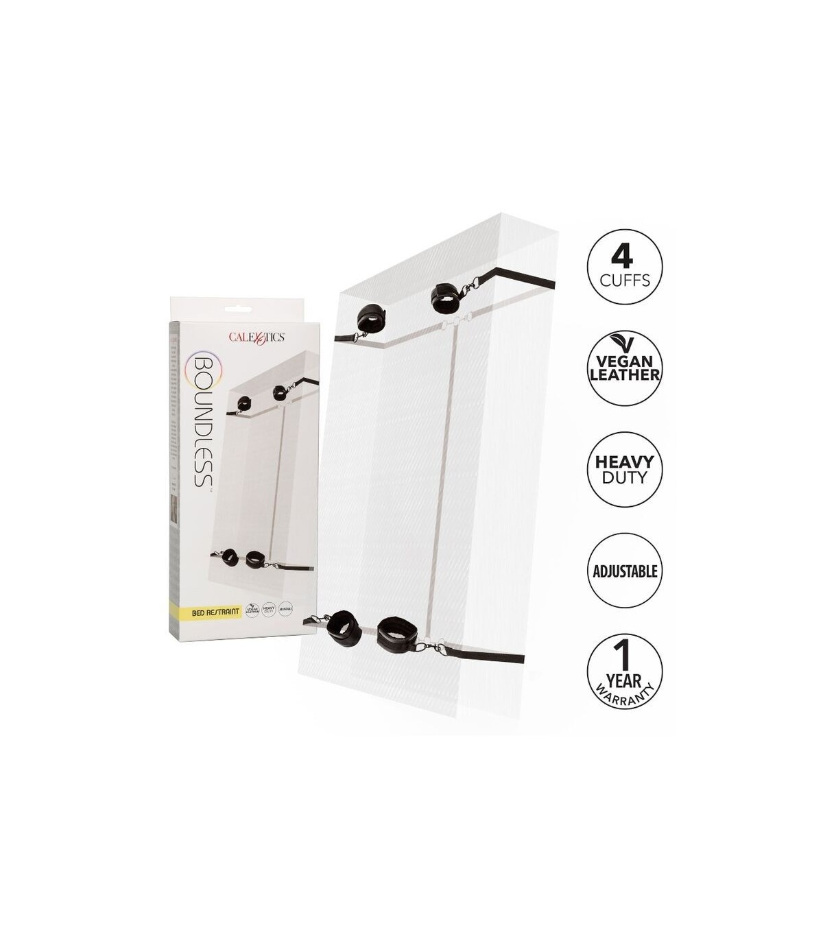 - Información adicional 4 puños de muñeca o tobillo totalmente ajustables y desmontables | 4 robustas correas ajustables para adaptarse a la mayoría de los colchones | Puede utilizarse bajo cualquier cama o como ataduras individuales | Cierres universales y anillos en O con diseño giratorio para una total destreza | Interior suave y lujoso con exterior de cuero vegano | Costuras dobles acolchadas y cosidas | Diseño funcional, duradero y con textura