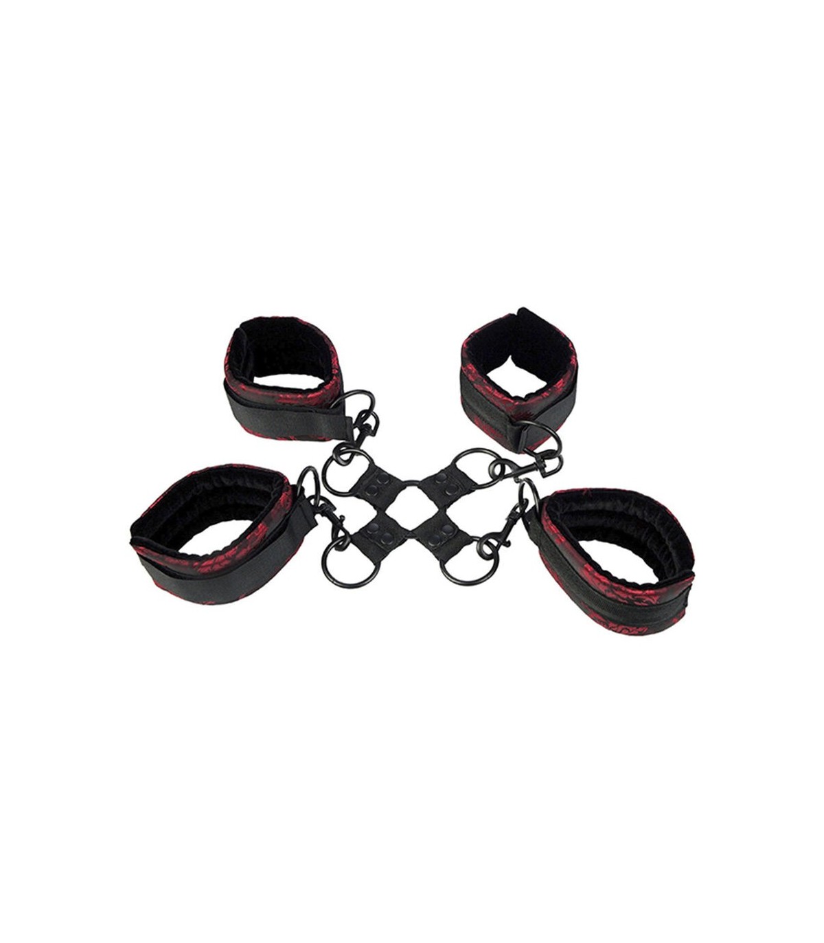 Sométete con estilo con el Scandal Hog Tie. Con cuatro esposas ajustables y suaves y un resistente conector central con anilla en O, esta herramienta de bondage es perfecta para una sujeción segura y cómoda.